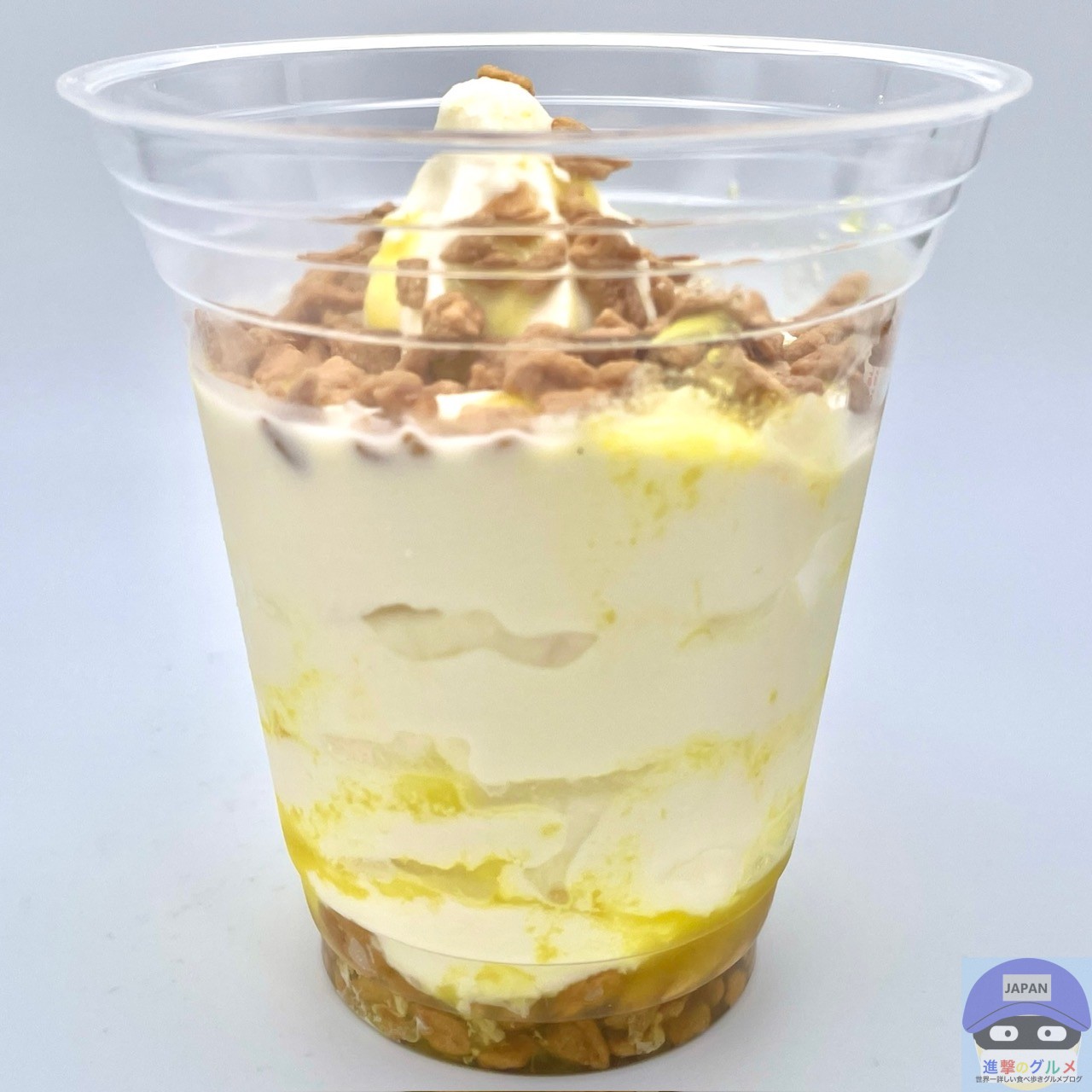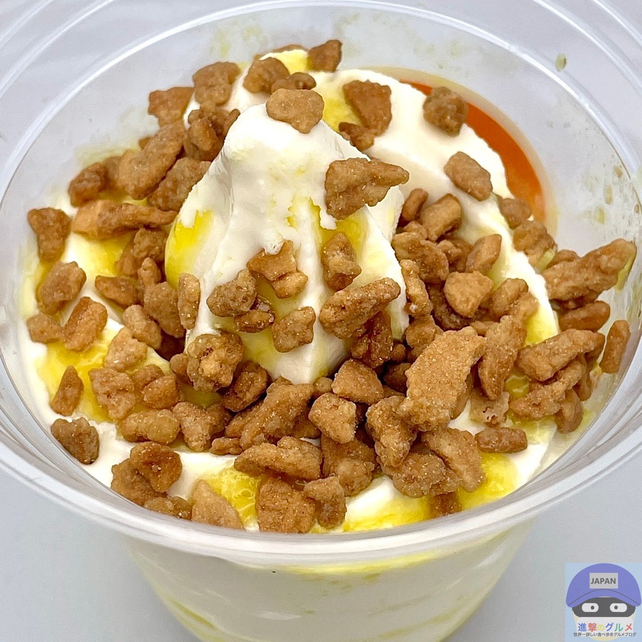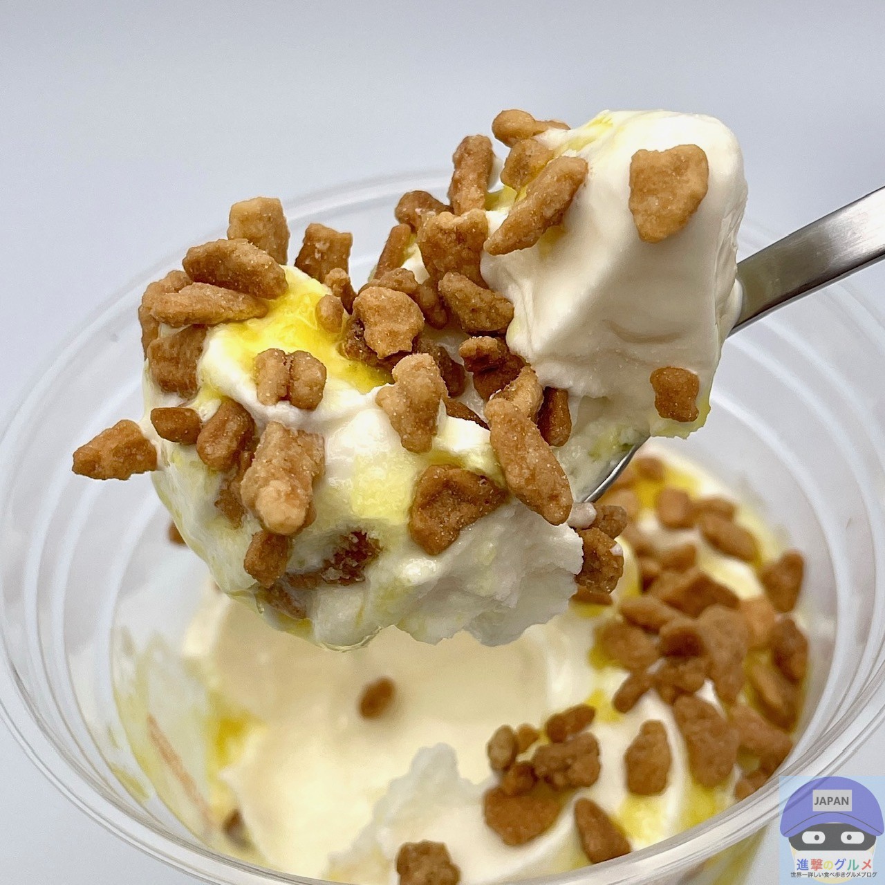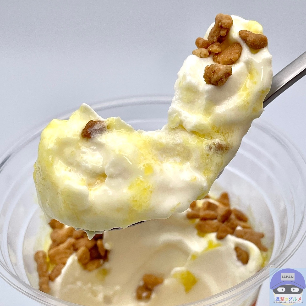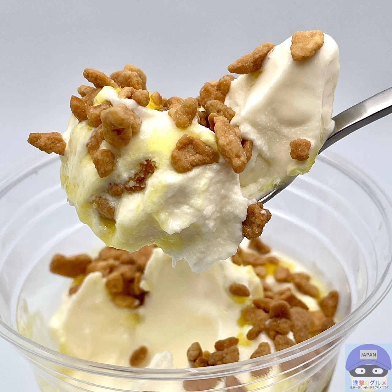 テイクアウト・持ち帰り、フロートドリンク用の透明なカップに入って、プラスチックのスプーンが付いています。