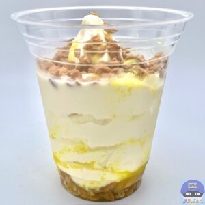 カップの上下にパイナップルソースとココナッツワッフルを入れることで、混ぜておいしいサンデーに仕上げています。