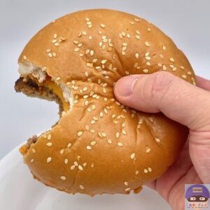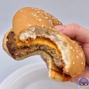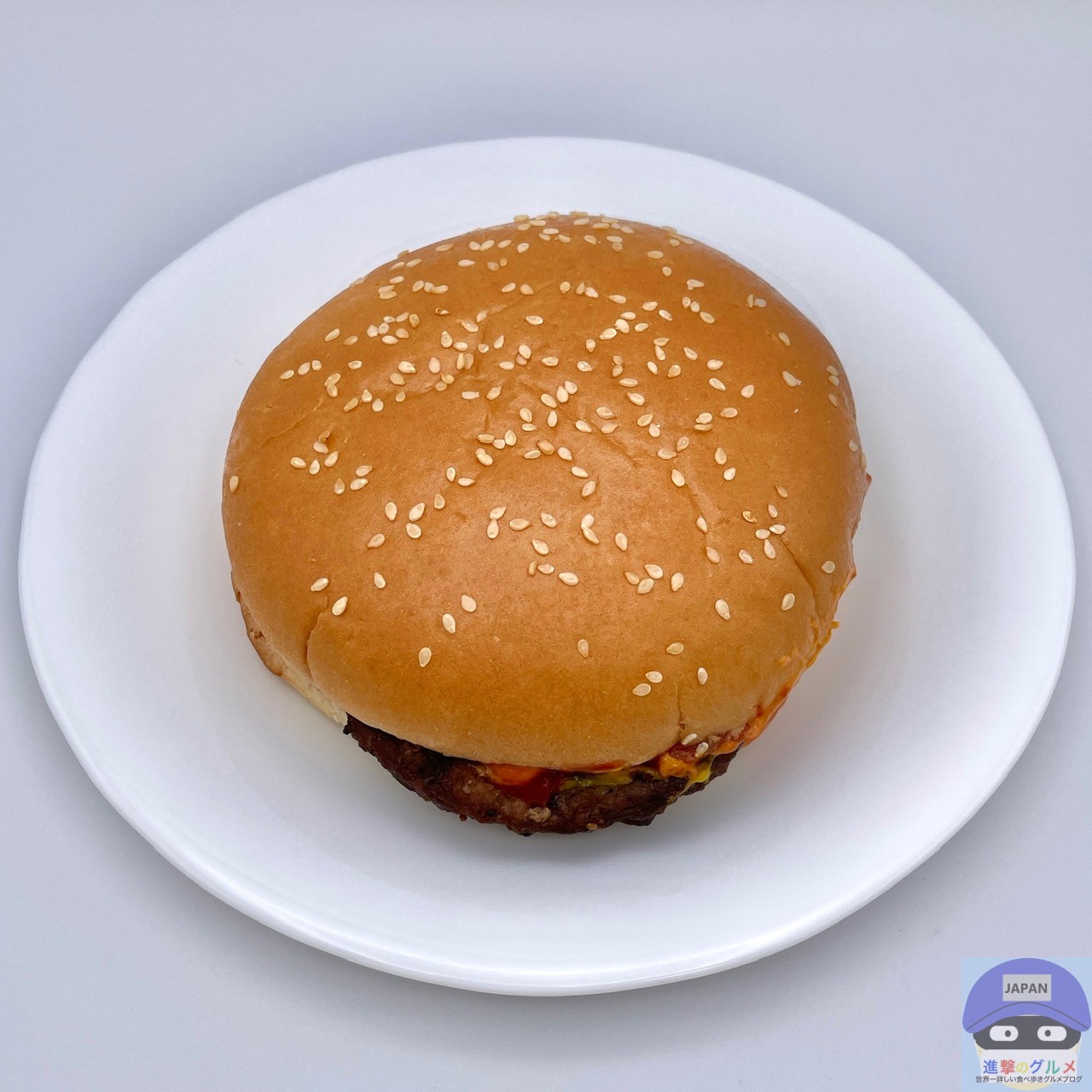 直火焼き100%ビーフパティ・チェダーチーズ2枚・特製ガーリックソース・ケチャップ・マスタード・ピクルスなどを、ゴマ付きバンズでサンドしています。