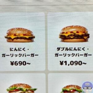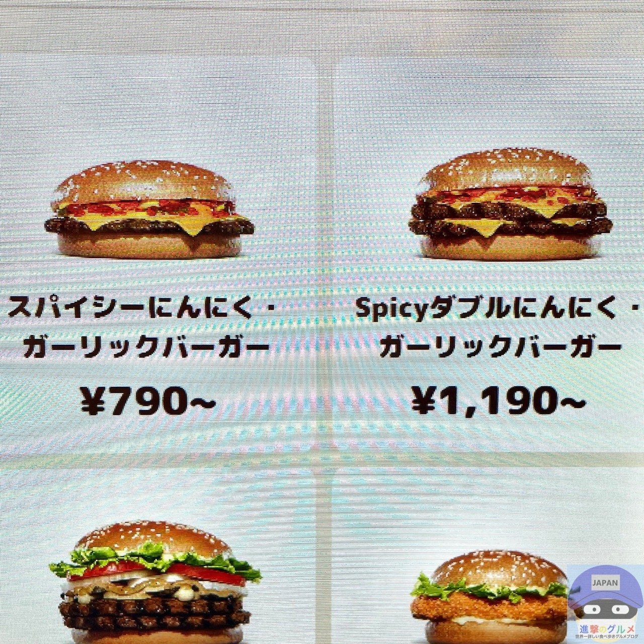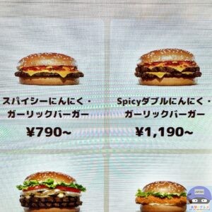 メニューは、「にんにく・ガーリックバーガー(690円)」、「ダブルにんにく・ガーリックバーガー(1090円)」、「スパイシーにんにく・ガーリックバーガー(790円)」、「ダブルスパイシーにんにく・ガーリックバーガー(1190円)」です。