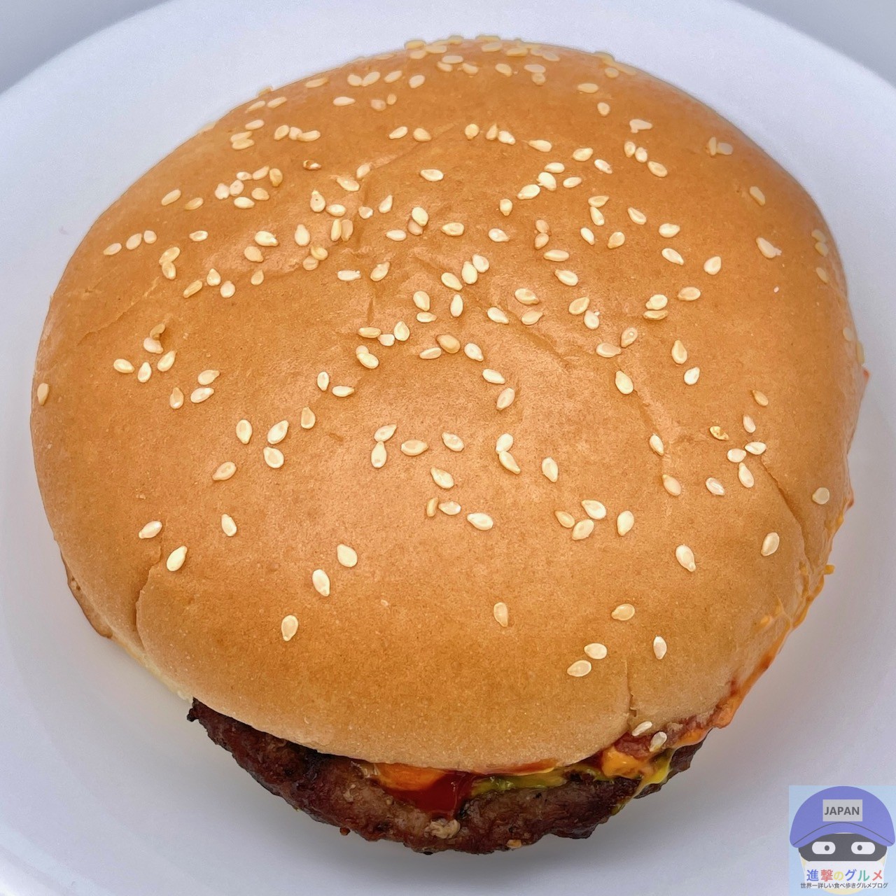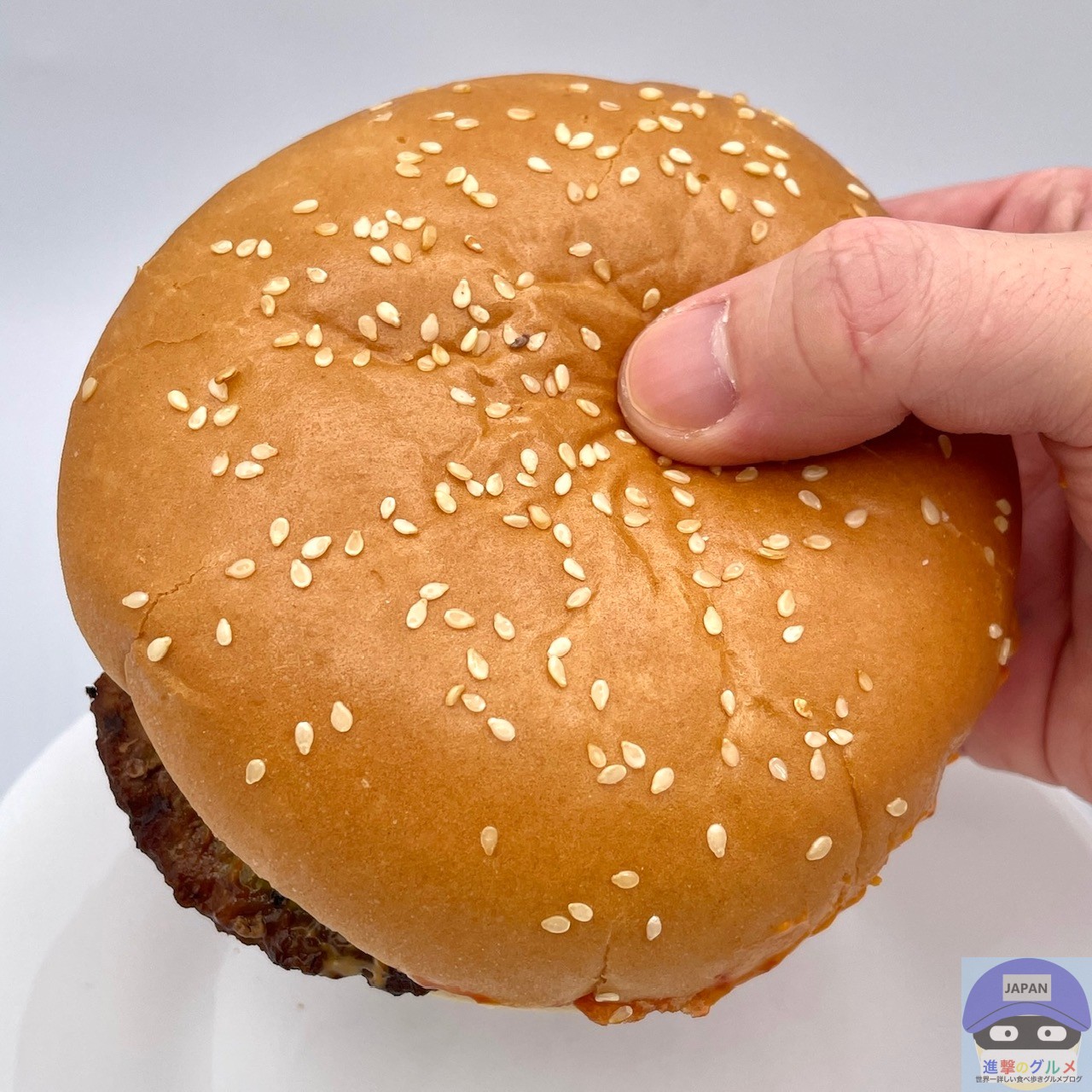 ふんわりした大きめのゴマ付きバンズで、特製ガーリックソースは、ガツンとにんにくがよく効いたマヨソースのような旨味、唐辛子系のヒリヒリした刺激的な辛味が広がる辛口です。