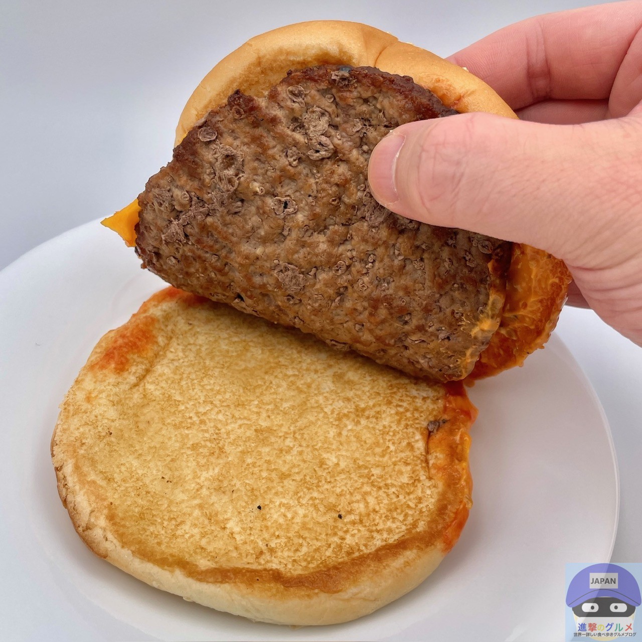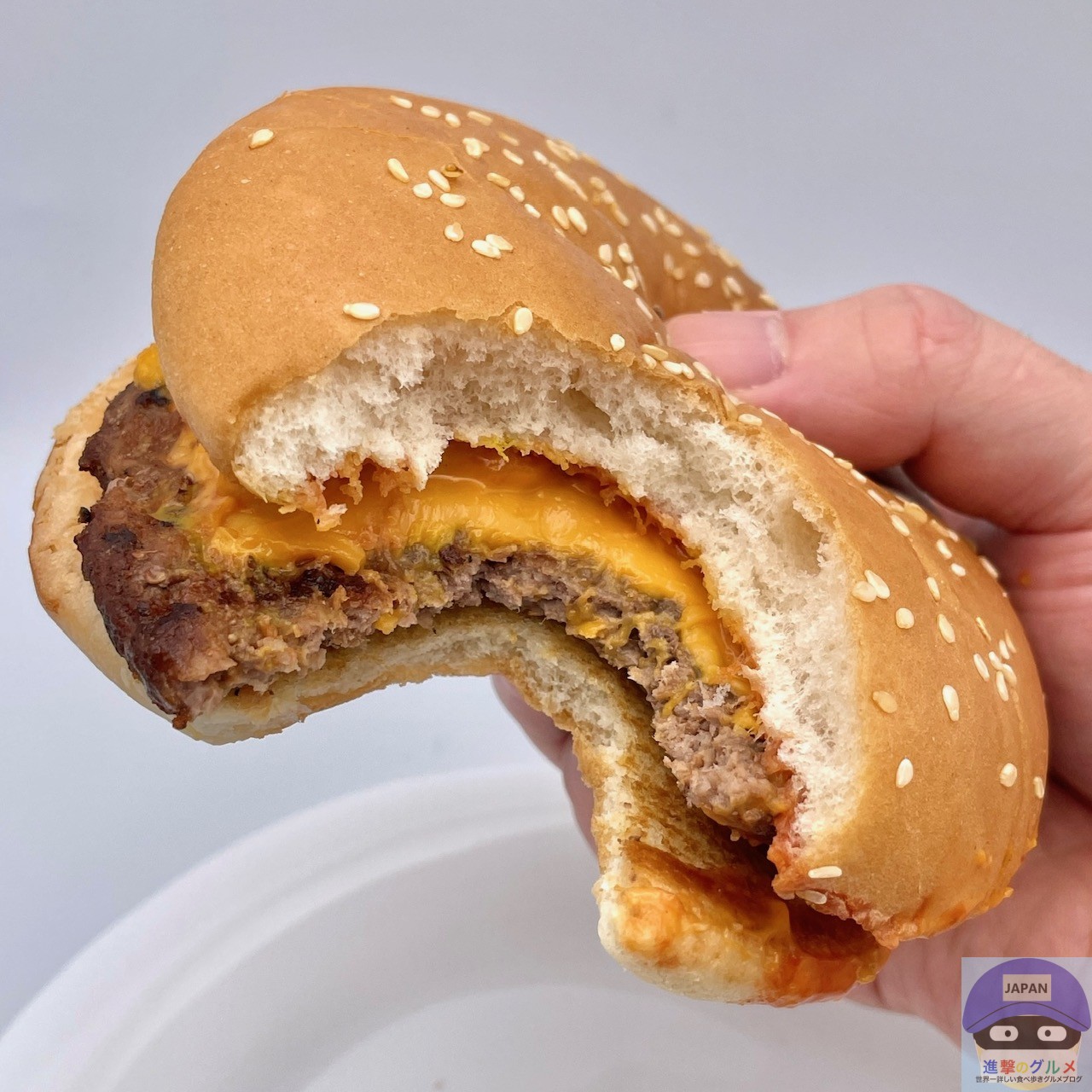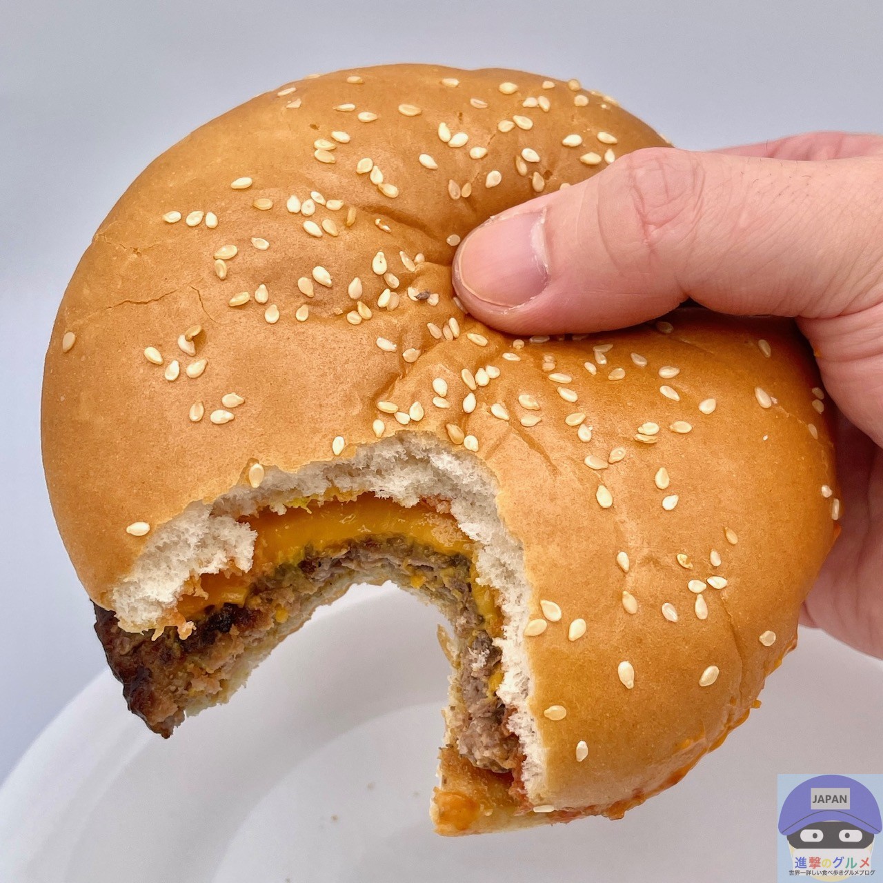 ピクルスのシャキッと食感と酸味がアクセント、直火焼き100%ビーフパティの香ばしい旨味、チェダーチーズのまろやかさも良いです。