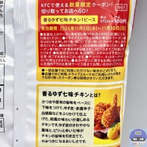 原材料名、アレルギー物質表示、栄養成分表示、「香るゆず七味チキン」についてなどです。