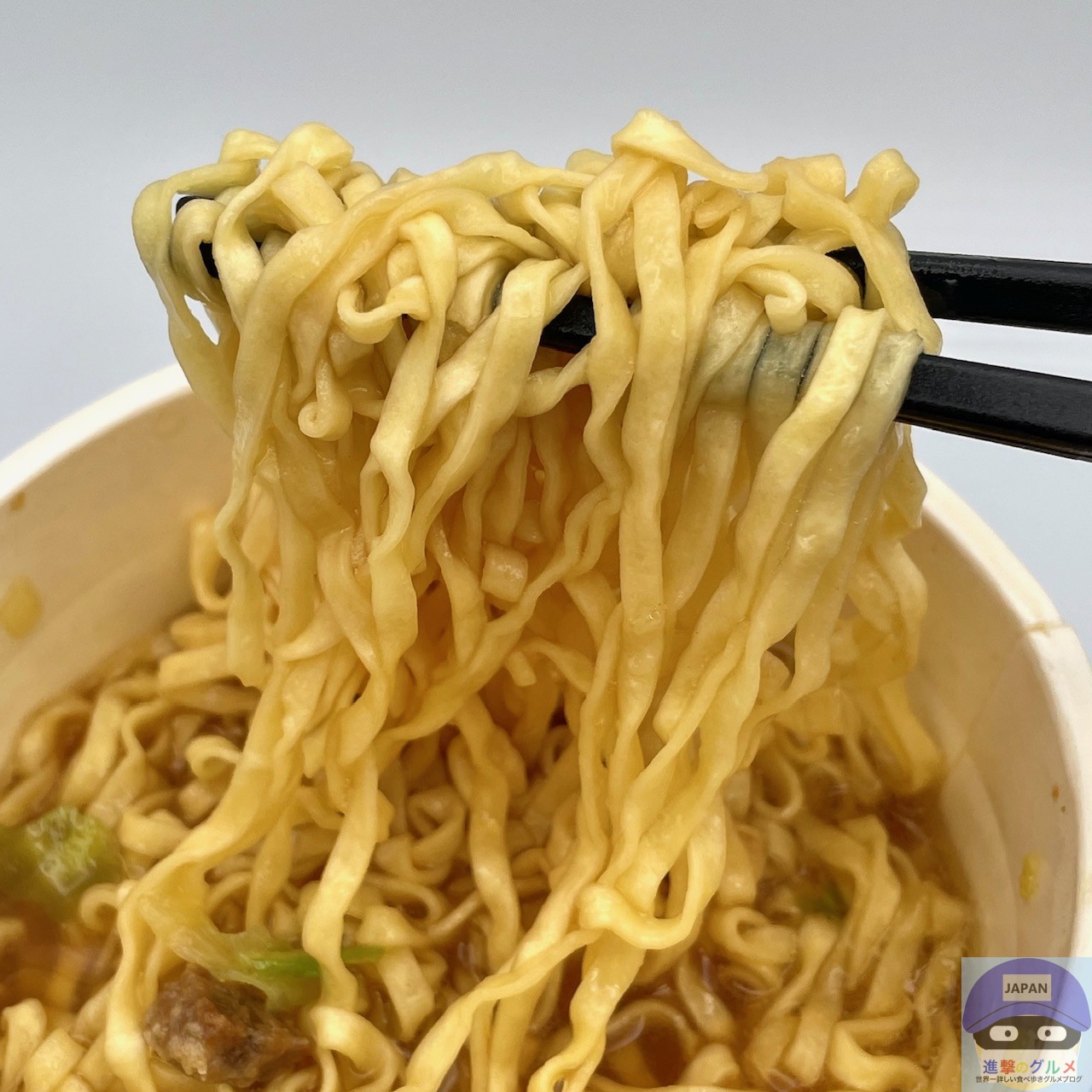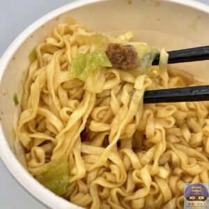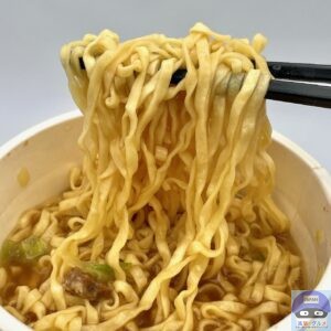 熱々ずるっと、つるみのあるしなやかな麺でカップヌードルの馴染みの”油揚げめん”の味わいです。