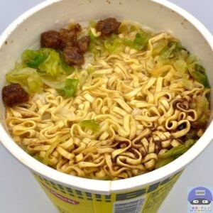 かやくは、キャベツ、謎肉(大豆たん白入り豚ミンチ加工品)、背脂加工品が入っています。