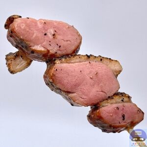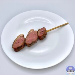 ガーリック・ペッパー・塩などで味付けし、りんごチップで燻製したあい鴨ロース(3切れ)が串に刺さっています。