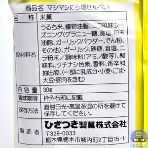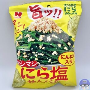 にら好きにはたまらない濃厚な味わい、「マシマシシリーズ」のにんにく入りにら塩せんべいです。