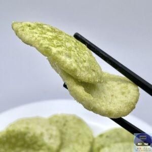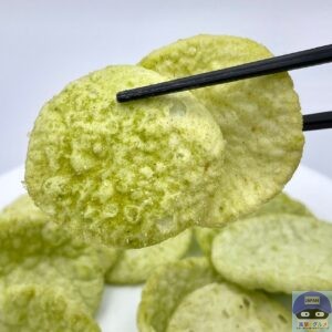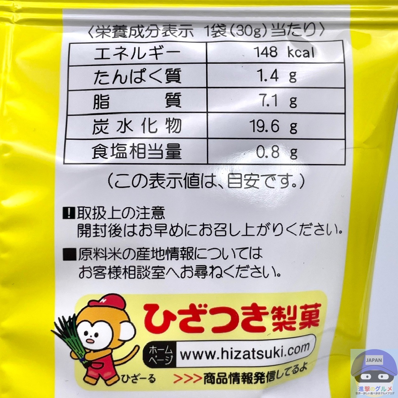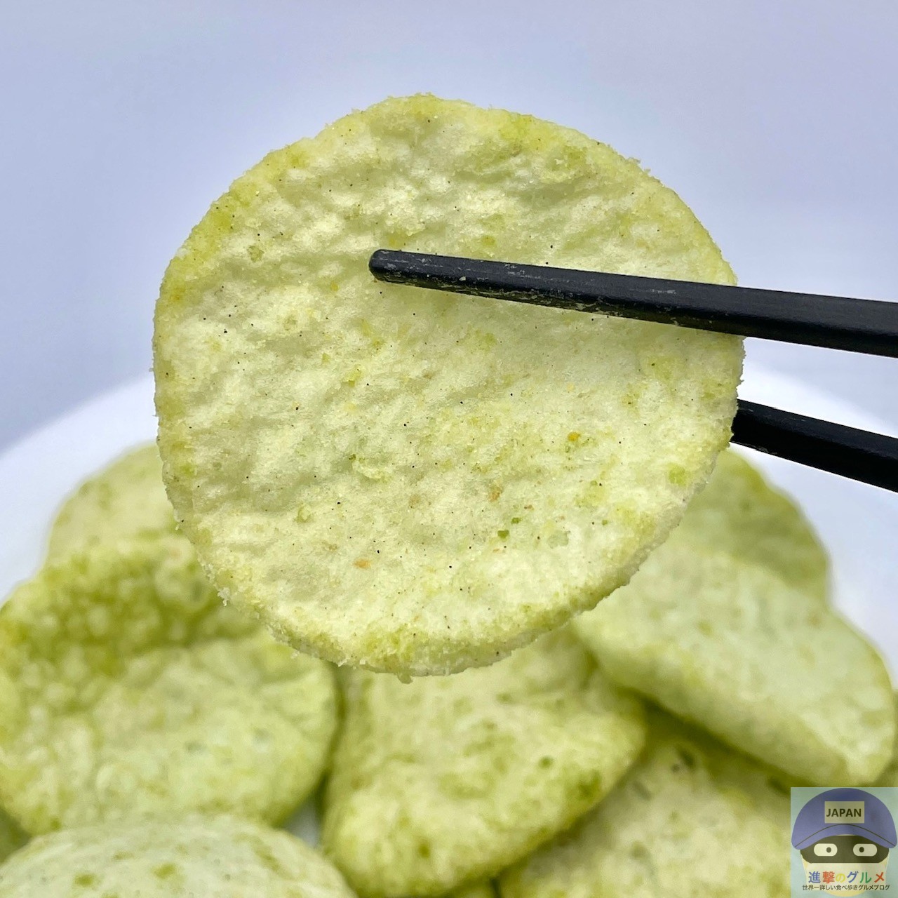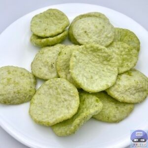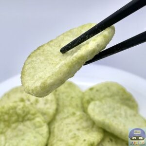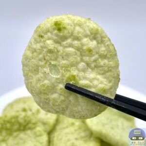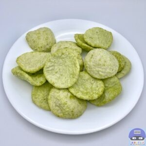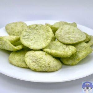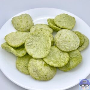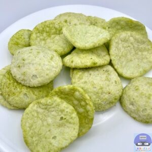 うるち米、植物油脂、にらパウダー、ガーリックパウダー、砂糖、食塩などで作られた、にらの香りがする厚みのある丸いせんべいです。