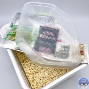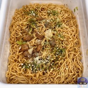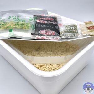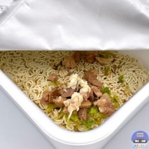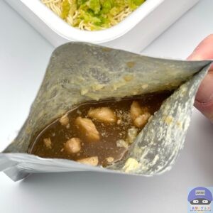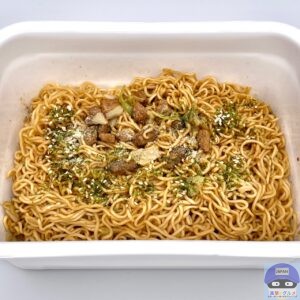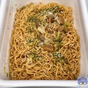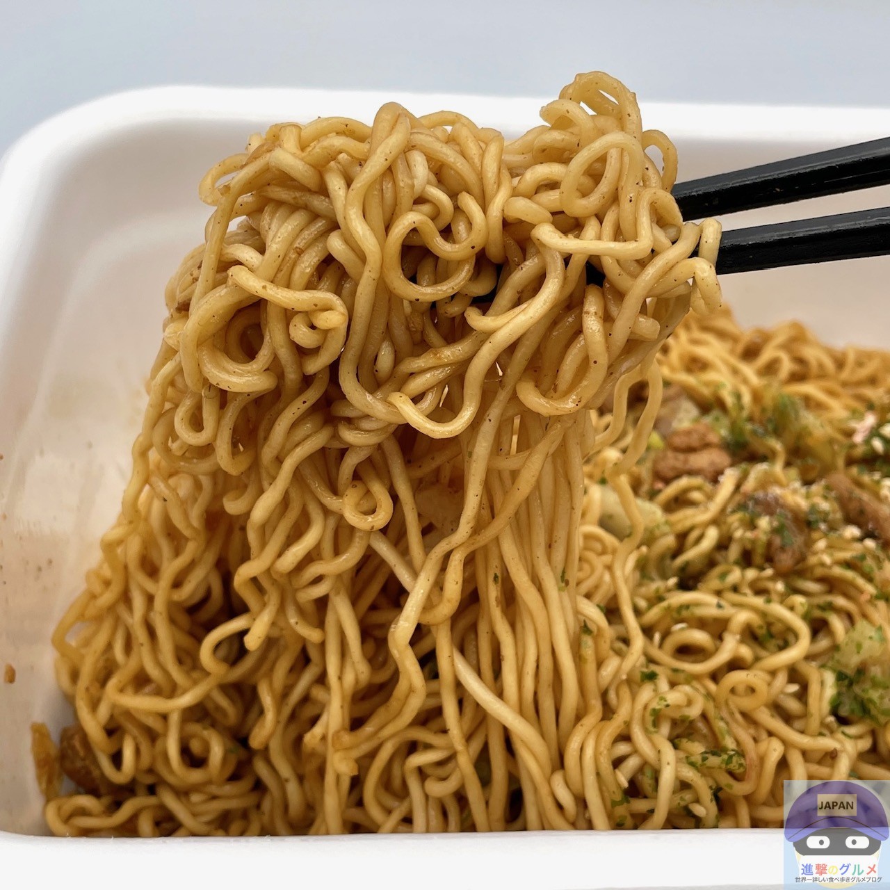 油揚げめんに対してソースがやや少なめ、小さめの具材のため、油揚げめんと具材を一緒に食べづらく、あまり特別感がありません。