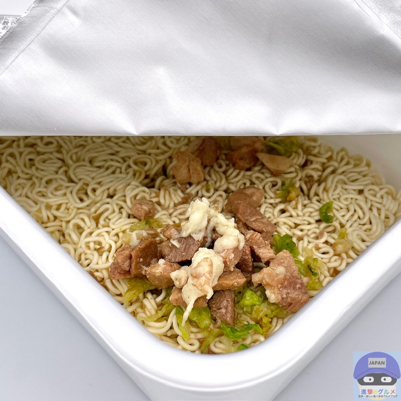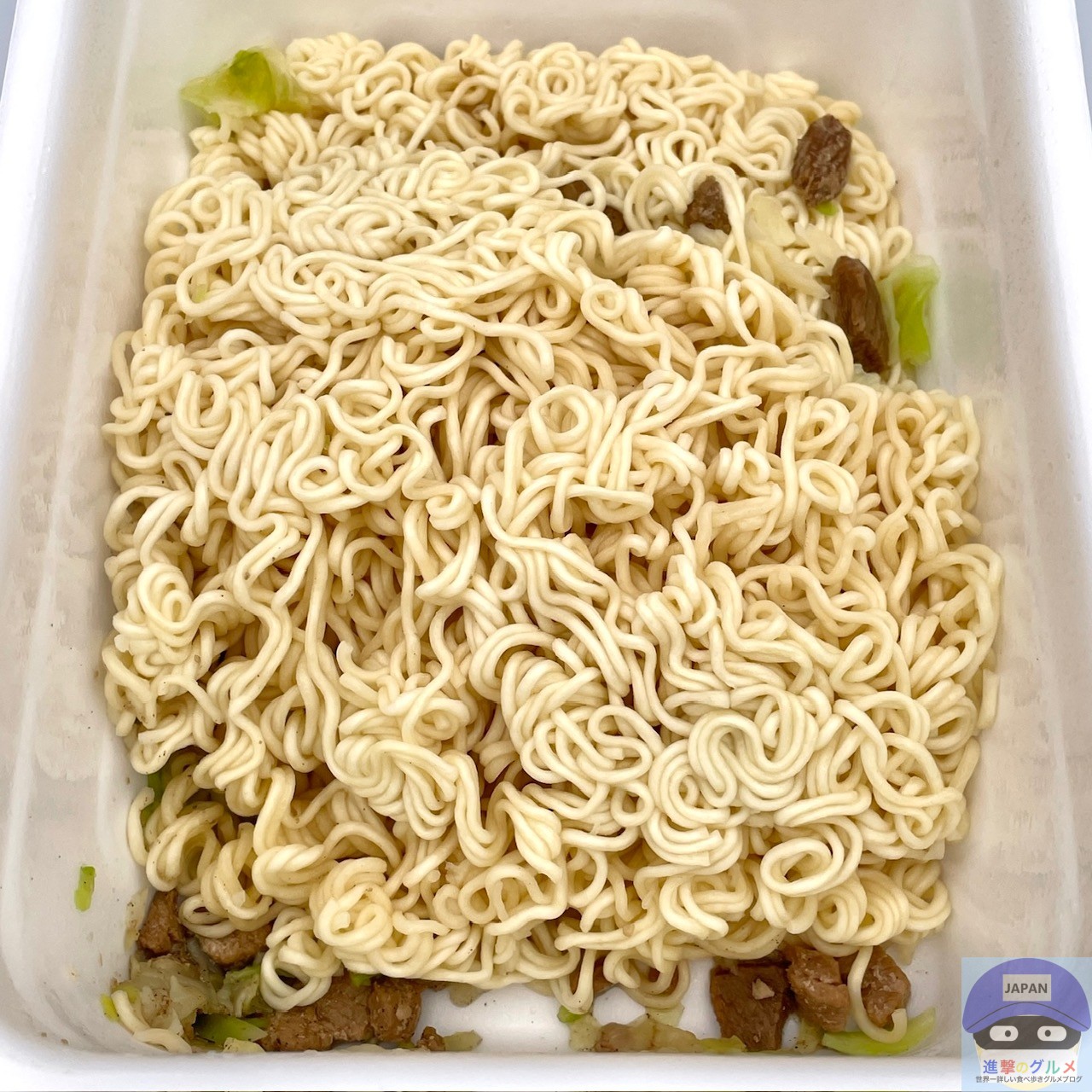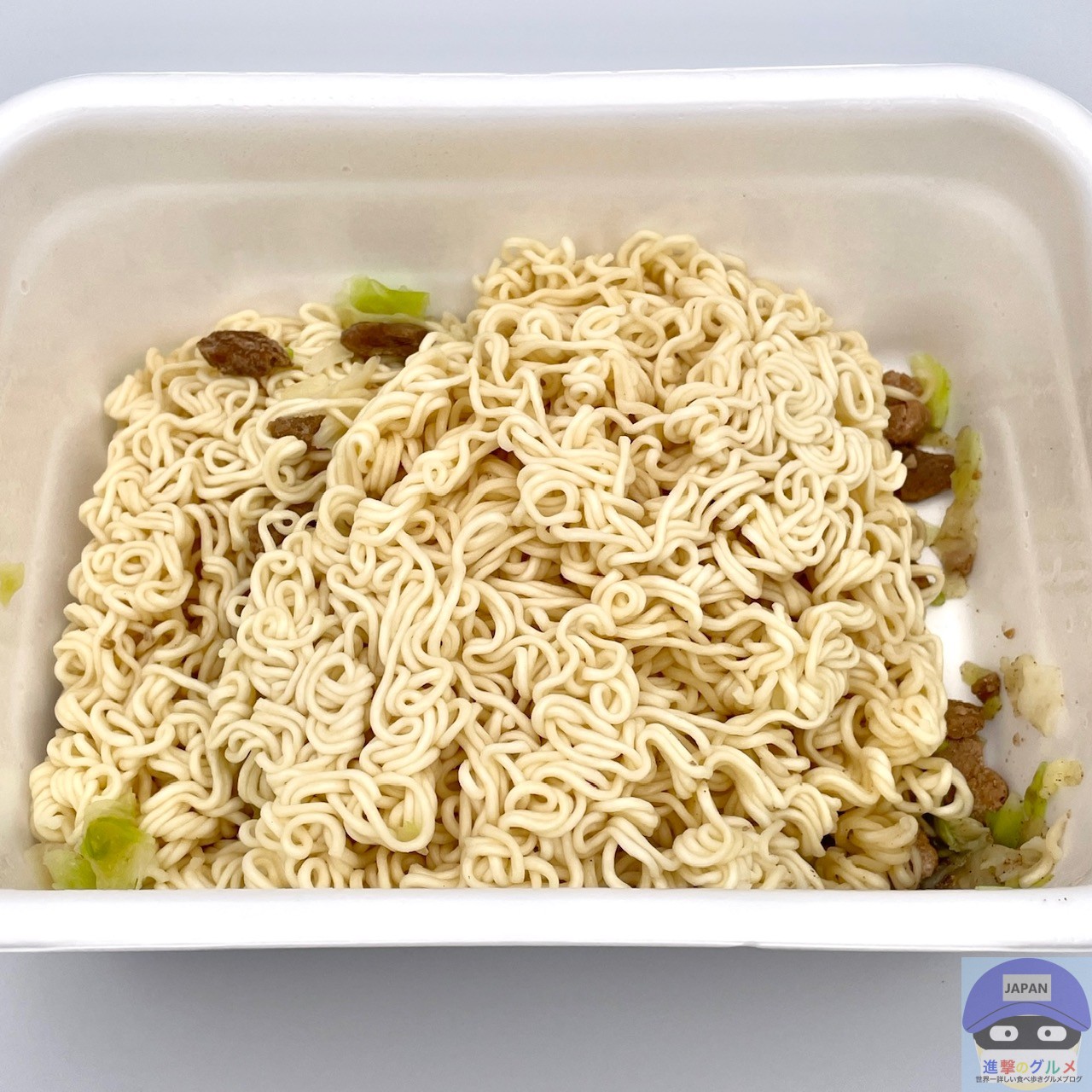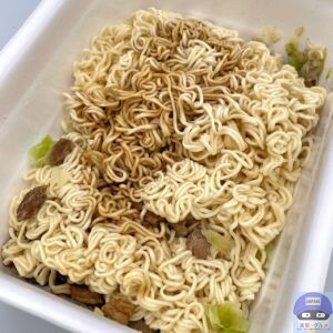 出来上がりの重さが容器を含めて539gでボリューム満点、具材は黒コショウの効いた豚肉、キャベツが入っています。
