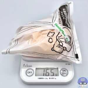 カロリーは338kcal、重さは包装を含めて165gです。