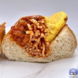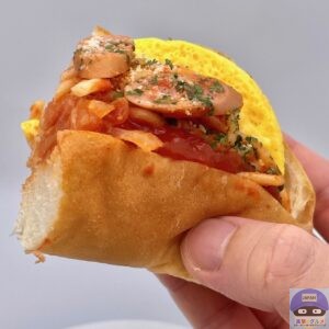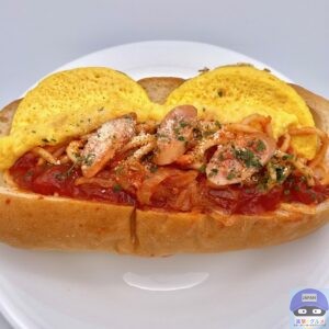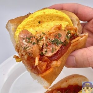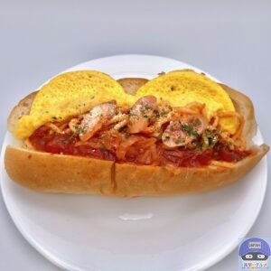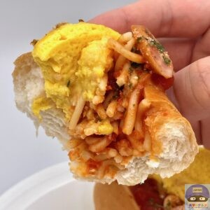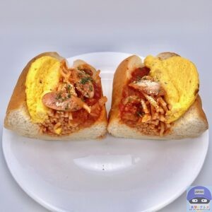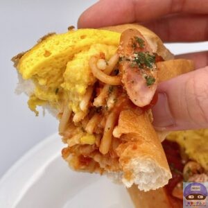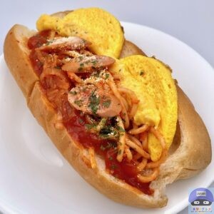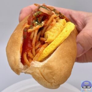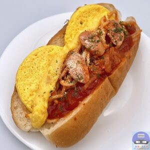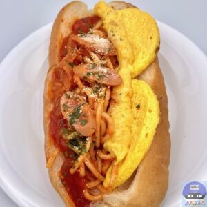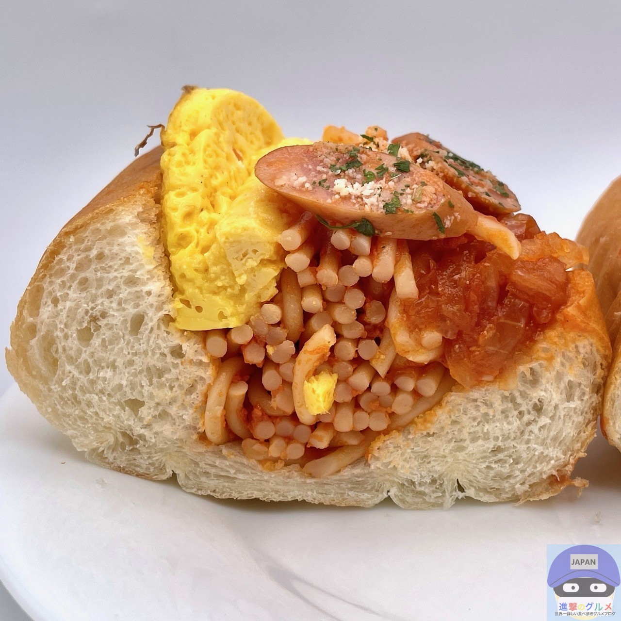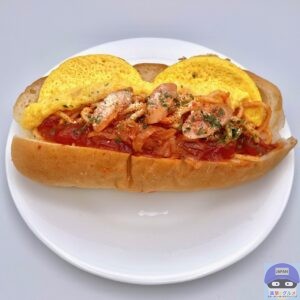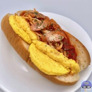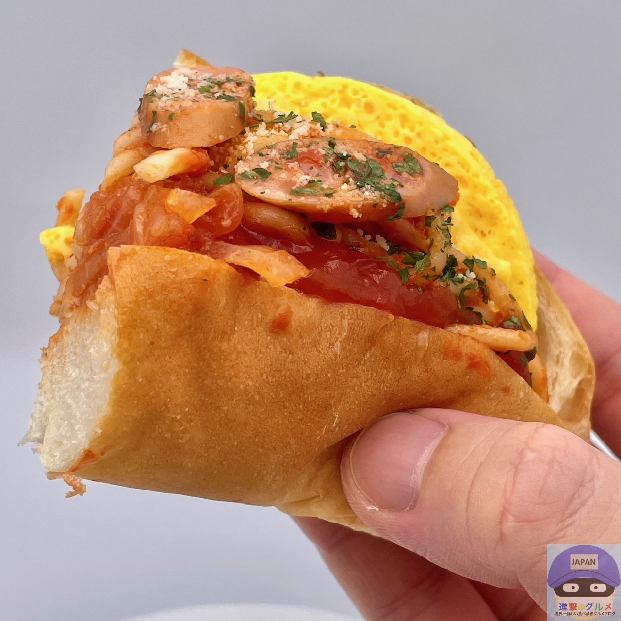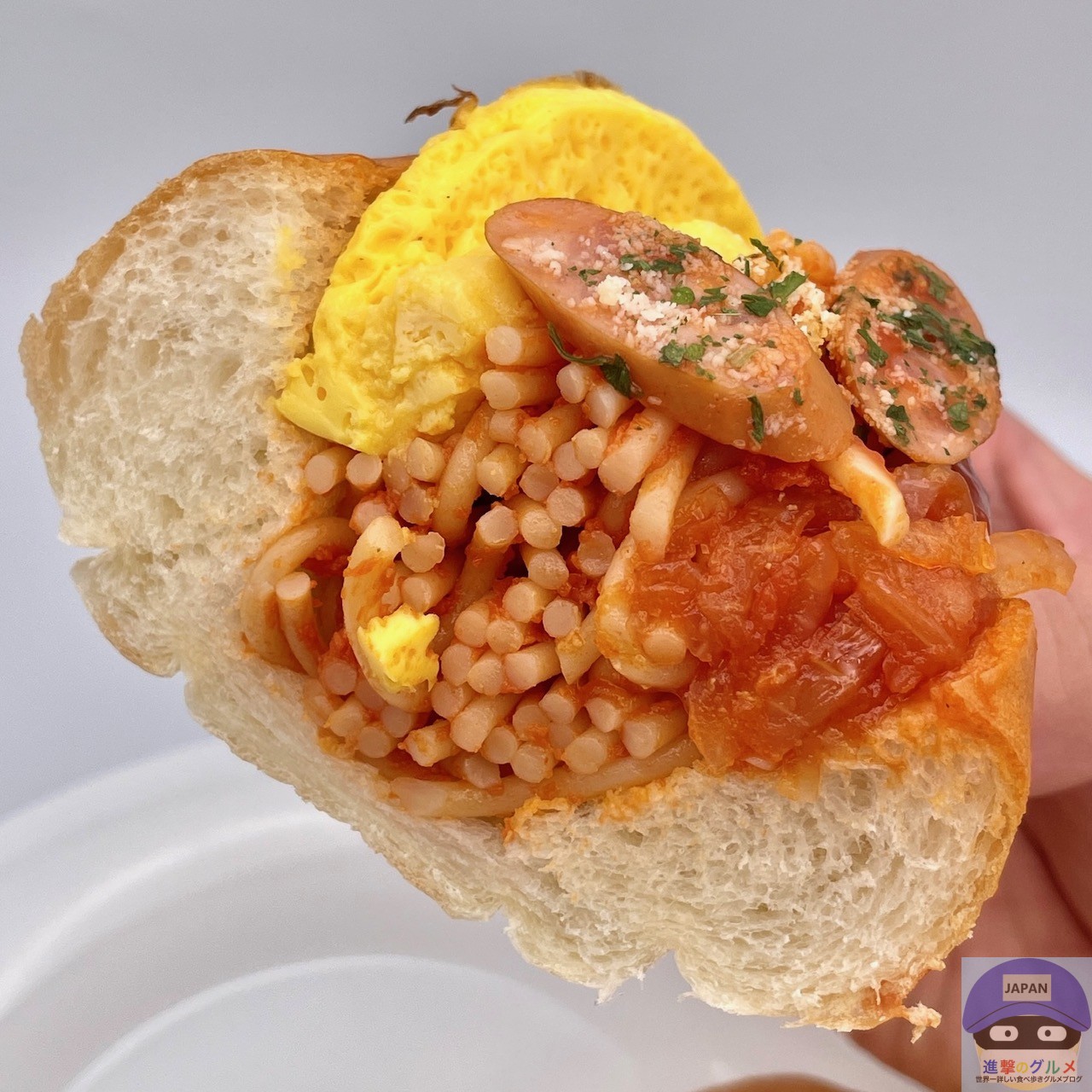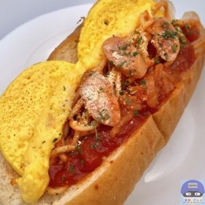 ソーセージ・玉ねぎ・ケチャップのナポリタン、オムレツ、スクランブルエッグなどを大きなロールパンで挟んでいます。