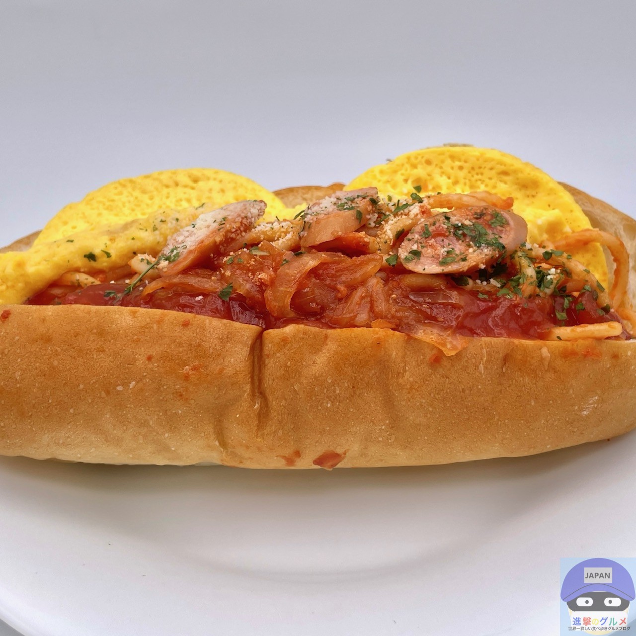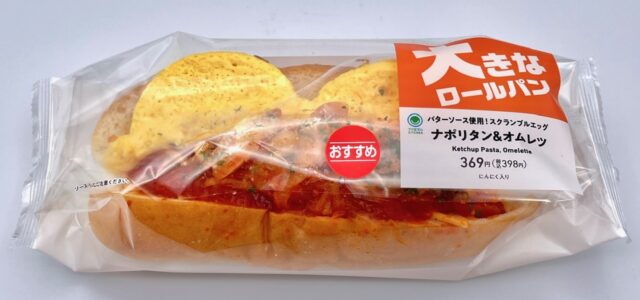大きなロールパンにナポリタンと相性の良いオムレツ、バターソース使用のスクランブルエッグ、ソーセージ、ケチャップと和えた玉ねぎを組み合わせた、ボリューム満点のコンビニパンです。