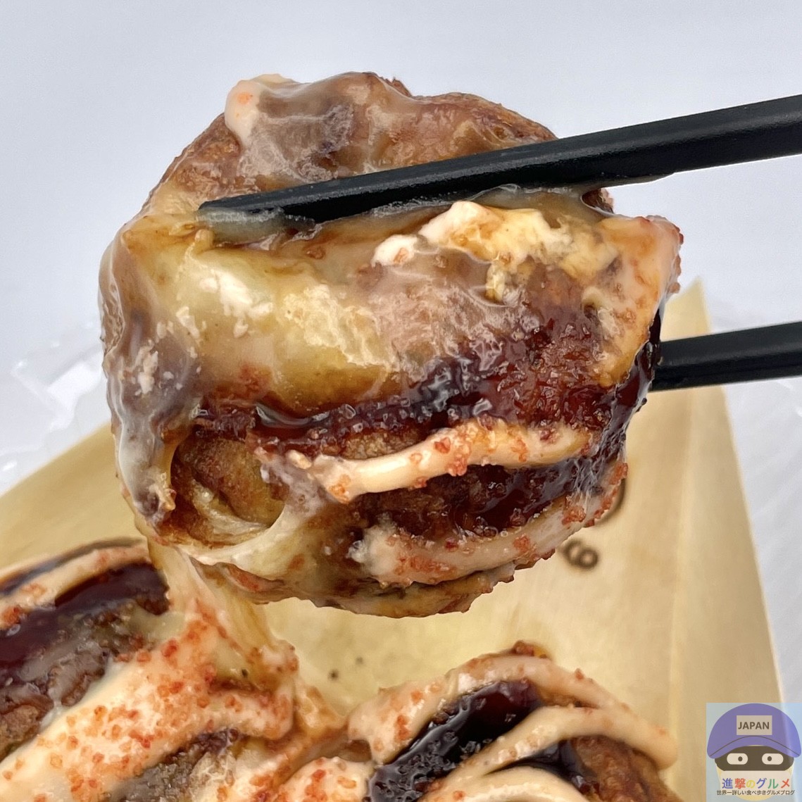 箸でたこ焼きを割ると、中身は、このような感じです。