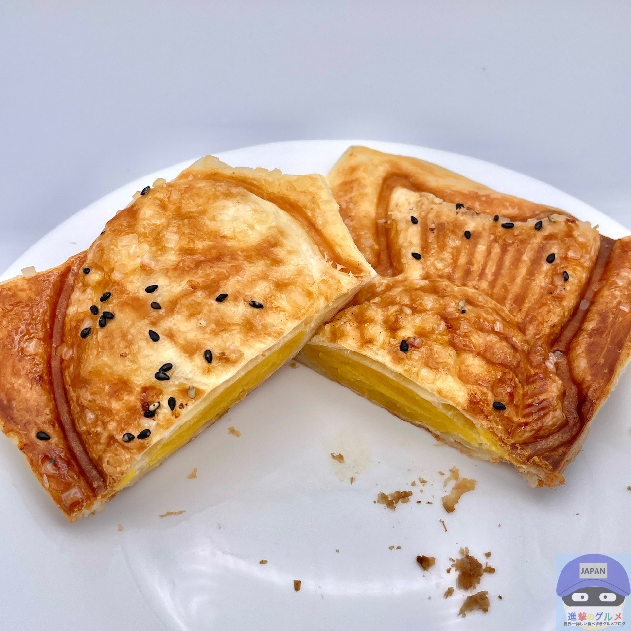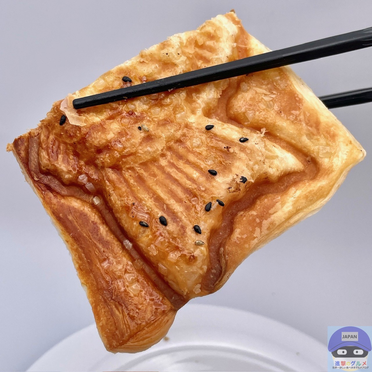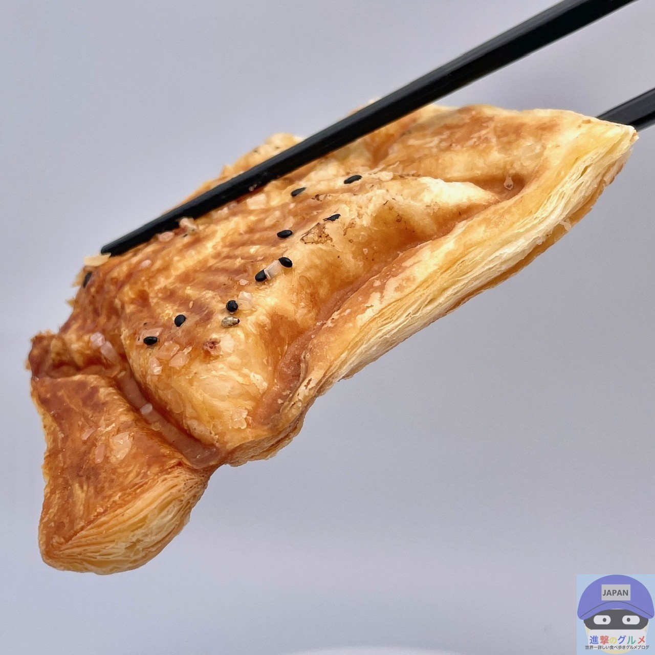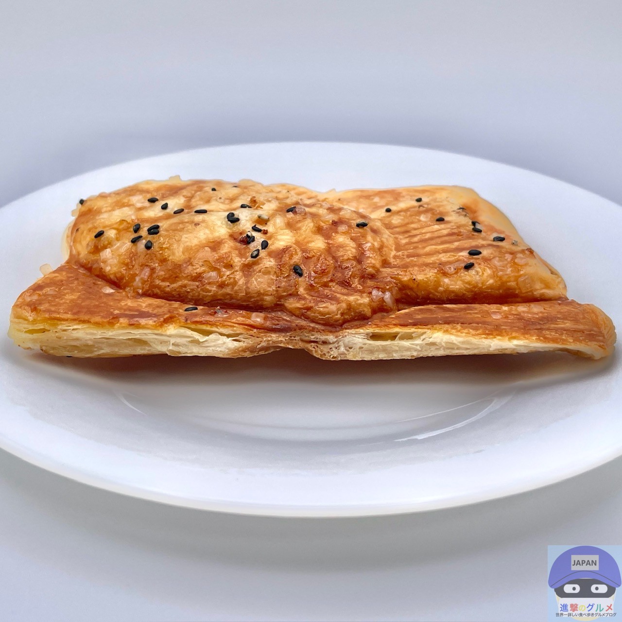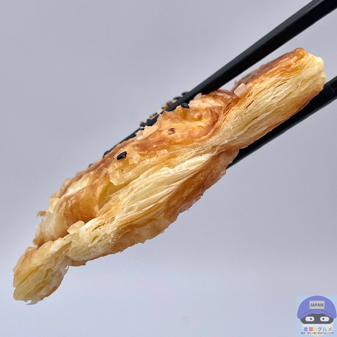 周りがサクサクッと少ししっとりした生地のパイ生地のような香ばしさ、カリッと食感のザラメ糖の甘みに、ごま塩がほんのりアクセントです。