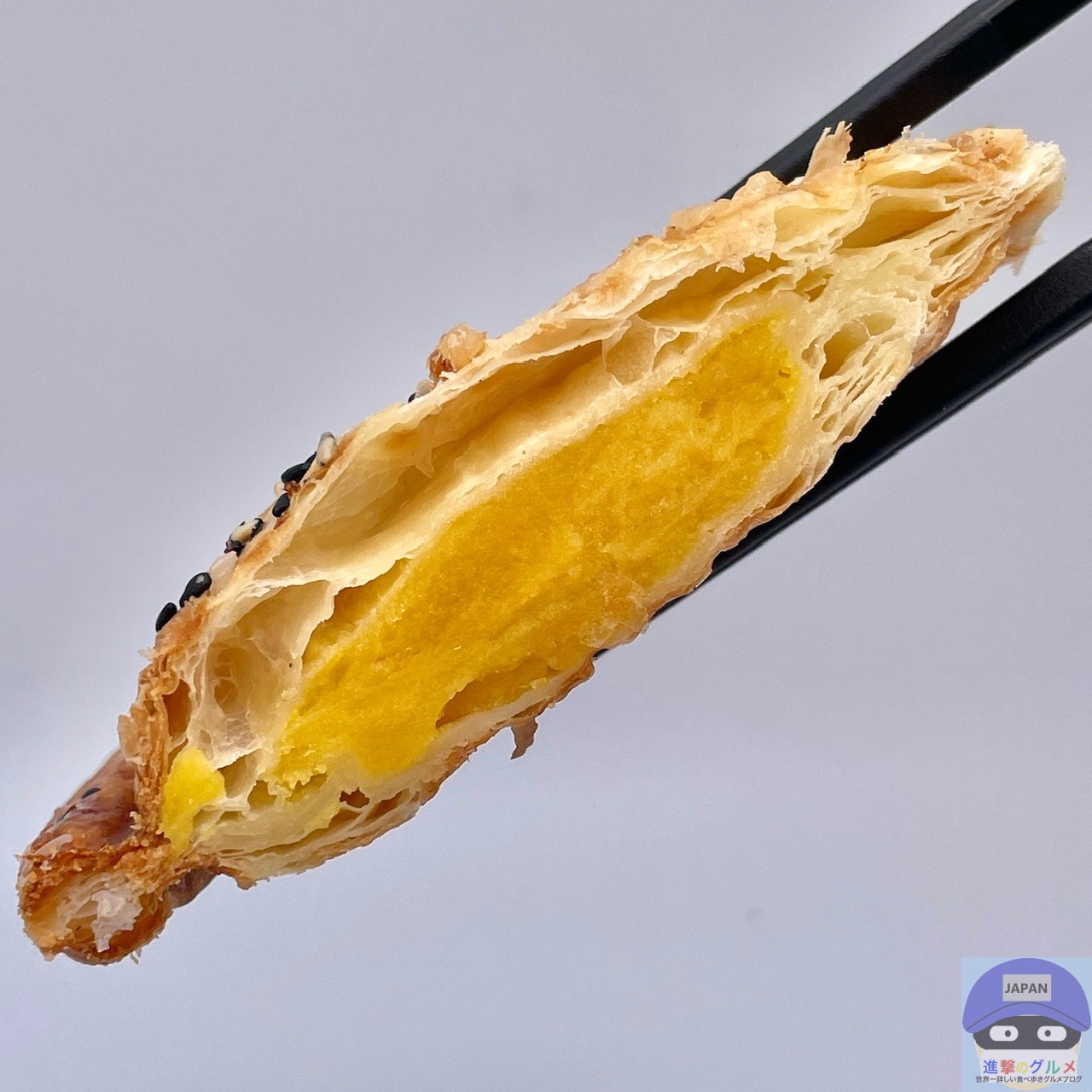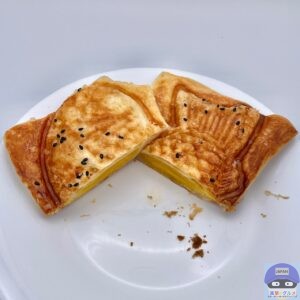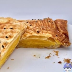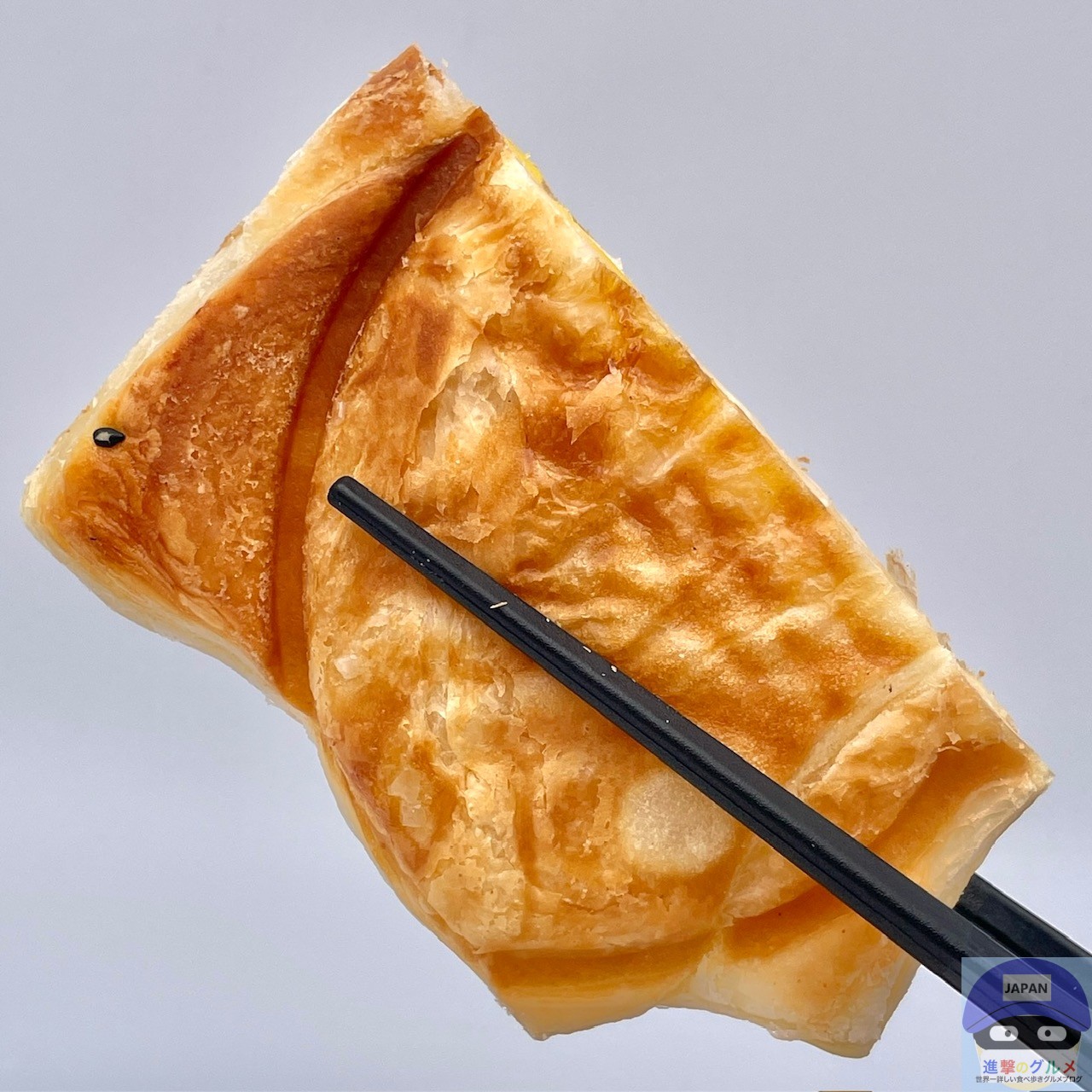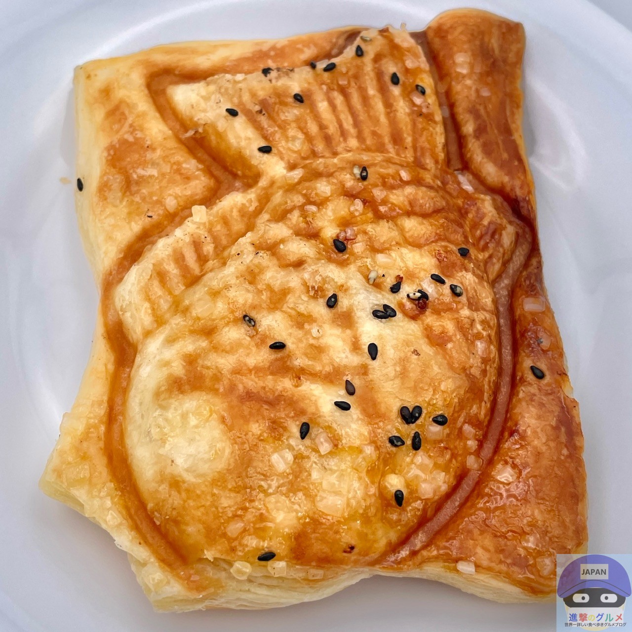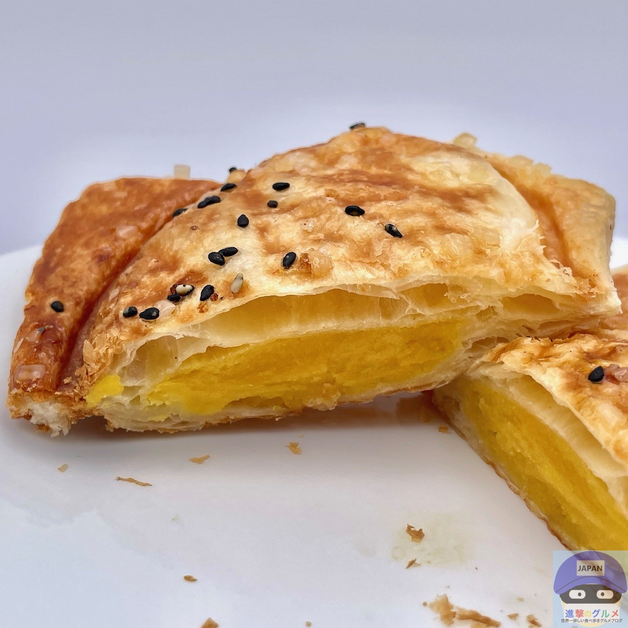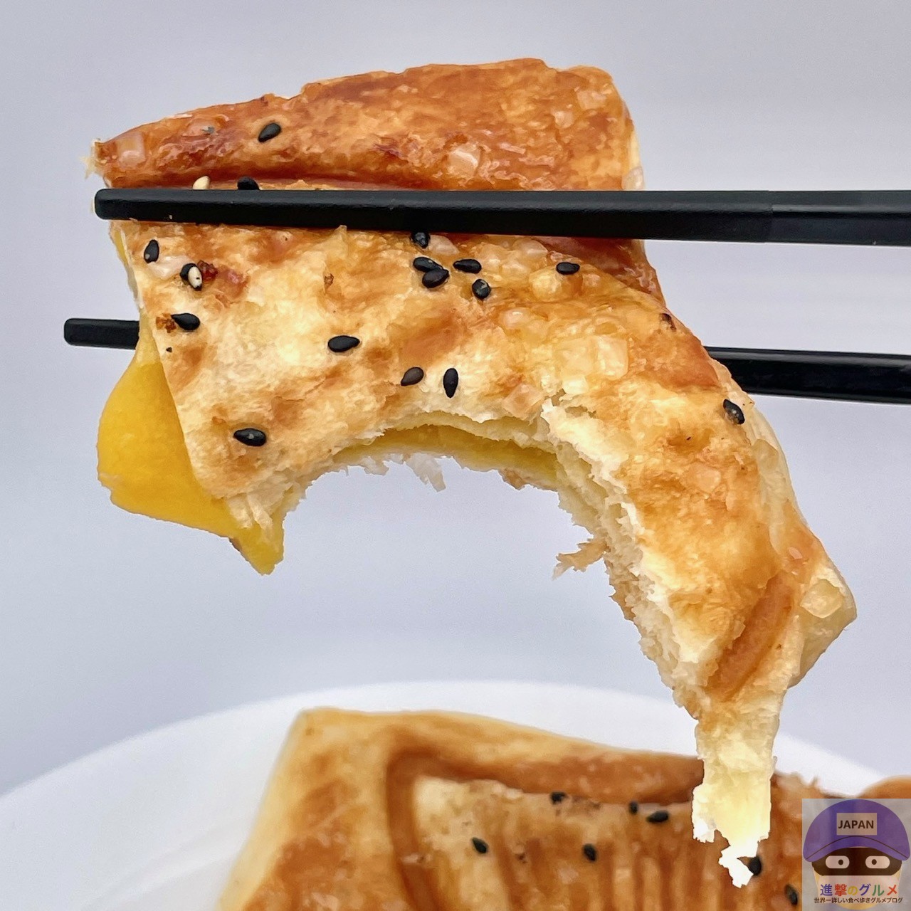 周りがサクサクッと少ししっとりした生地のパイ生地のような香ばしさ、カリッと食感のザラメ糖の甘みに、ごま塩がほんのりアクセントです。