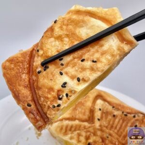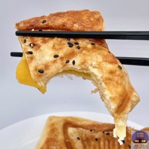 特製生地の表面(片面のみ)には、“ザラメ糖”と“ごま塩”をトッピングし、両面から高温で焼き上げることで、外側は香ばしくサクサクとした食感、中の餡は口どけなめらかな食感を楽しめます。