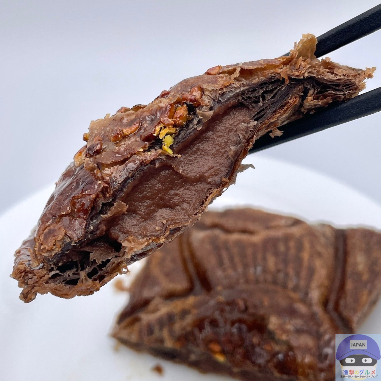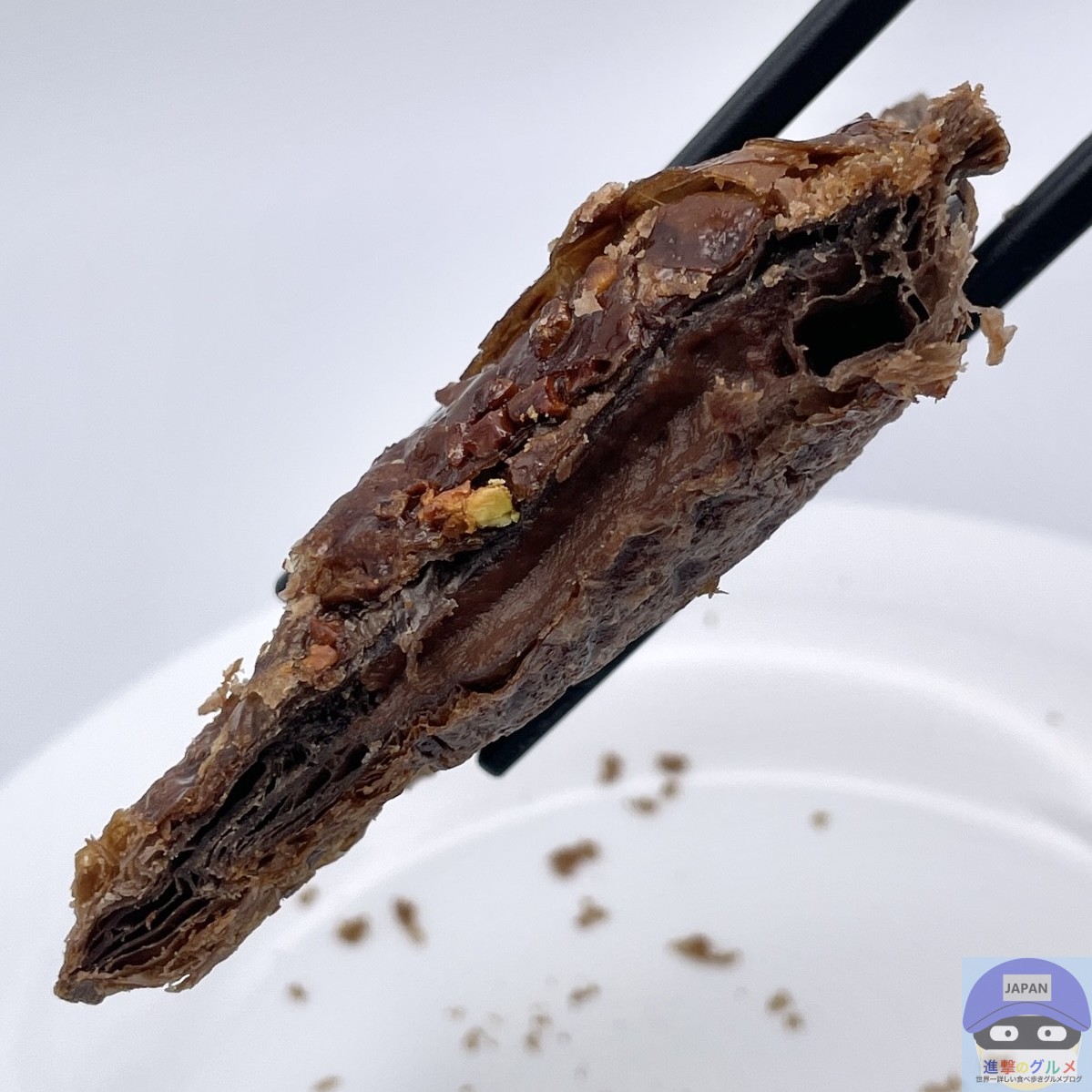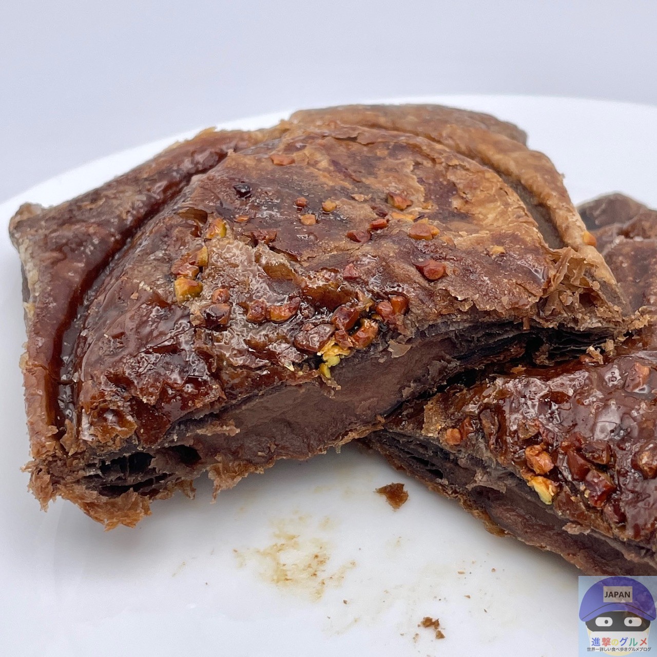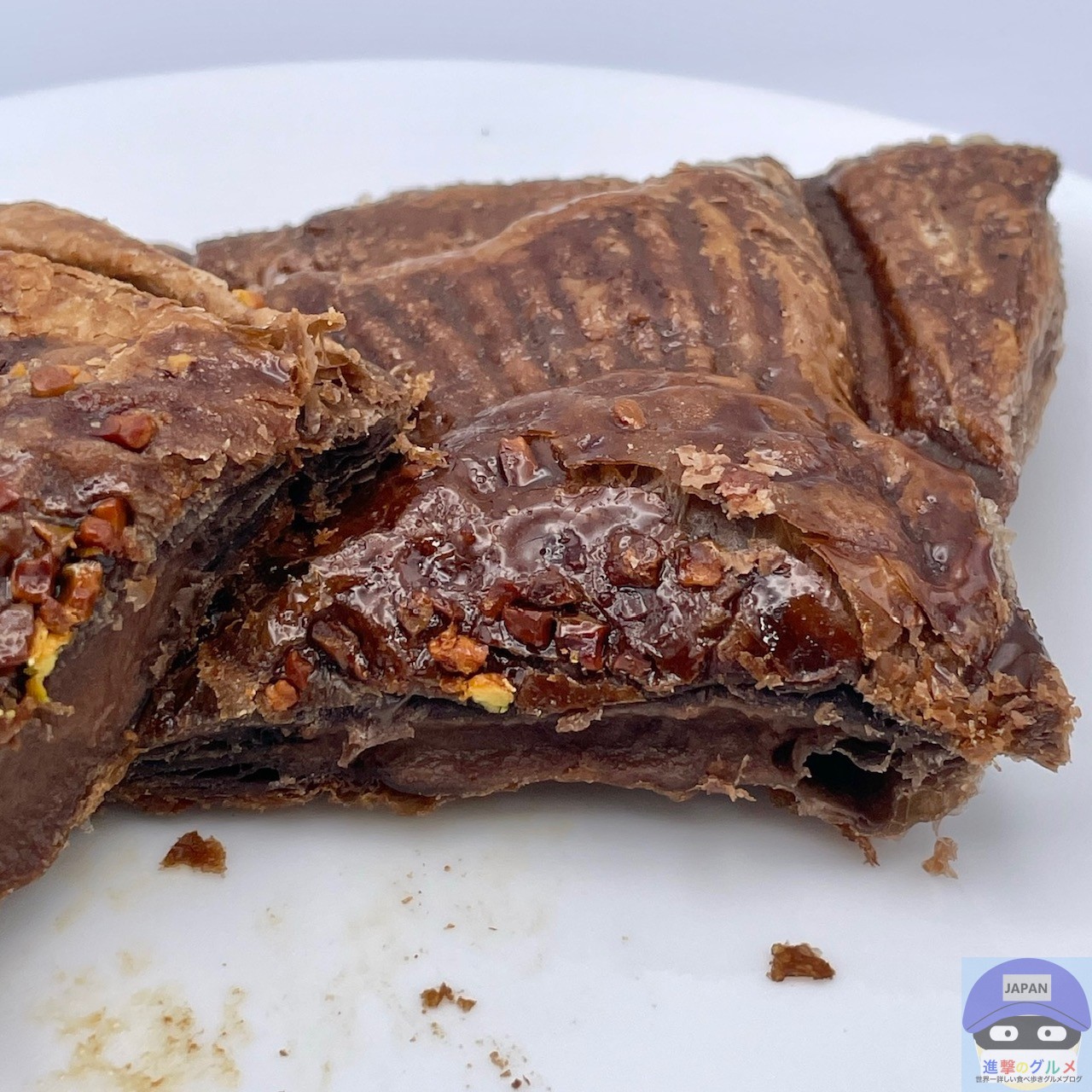 周りがサクサク、ややしっとりした生地のパイ生地のような香ばしさとカカオの風味、一部がカリッとした生ピスタチオのコクを感じます。