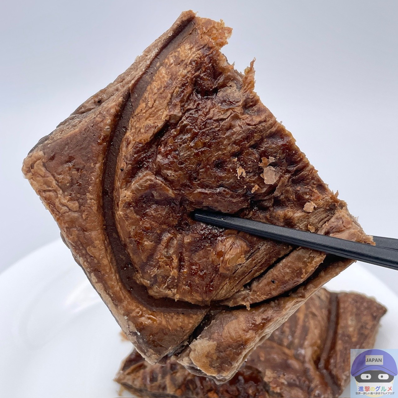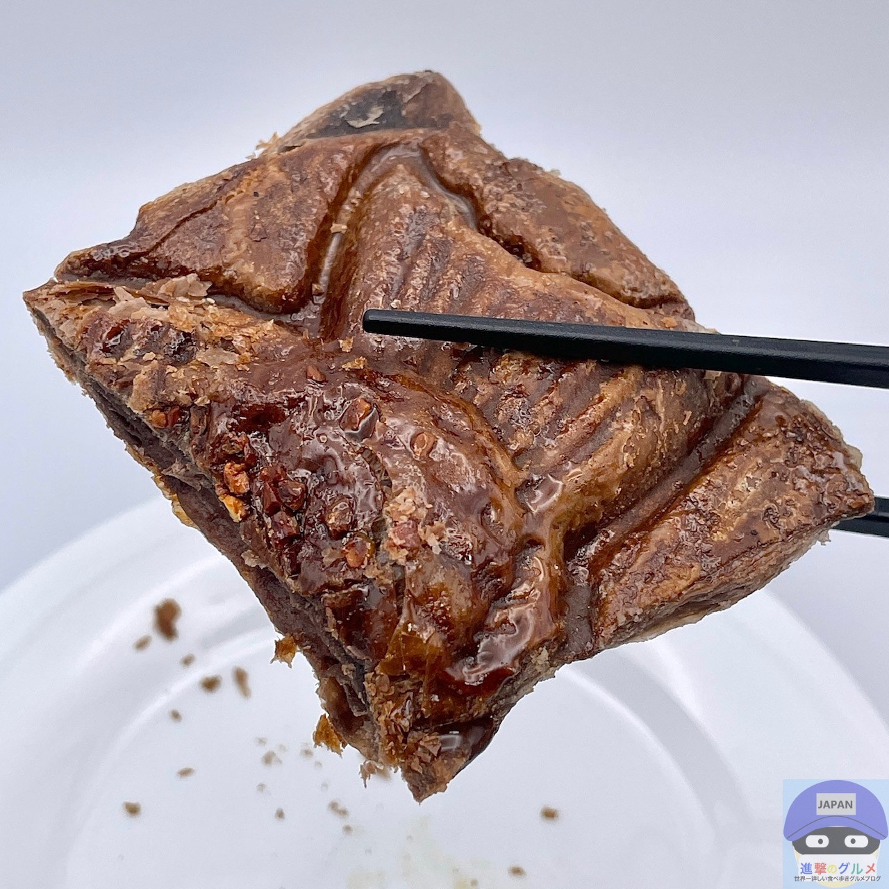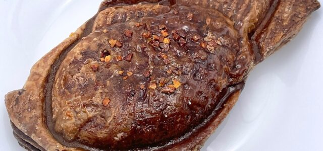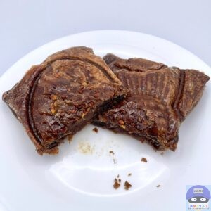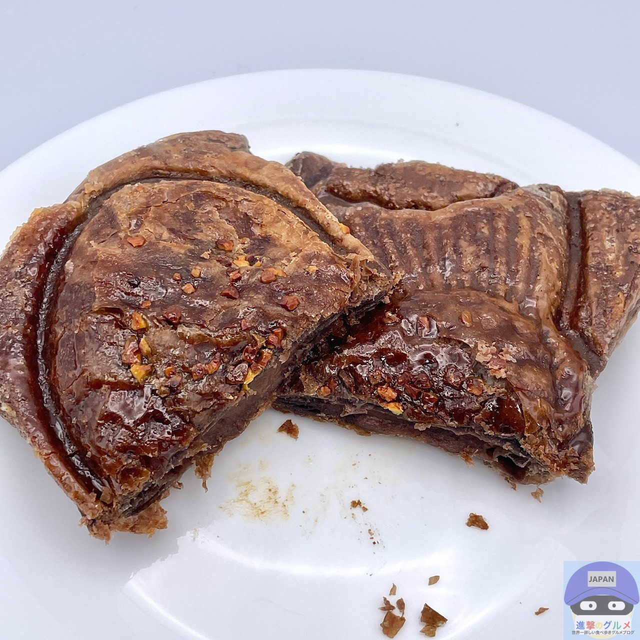 周りがサクサク、ややしっとりした生地のパイ生地のような香ばしさとカカオの風味、一部がカリッとした生ピスタチオのコクを感じます。