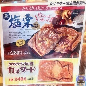 2023年以降、クロワッサンたい焼きの秋の期間限定「塩栗」が、今年はさらに”栗”感をアップして登場です。
