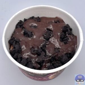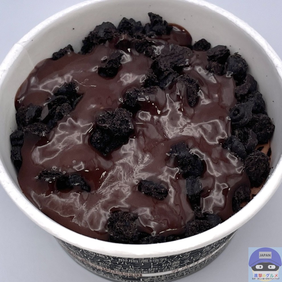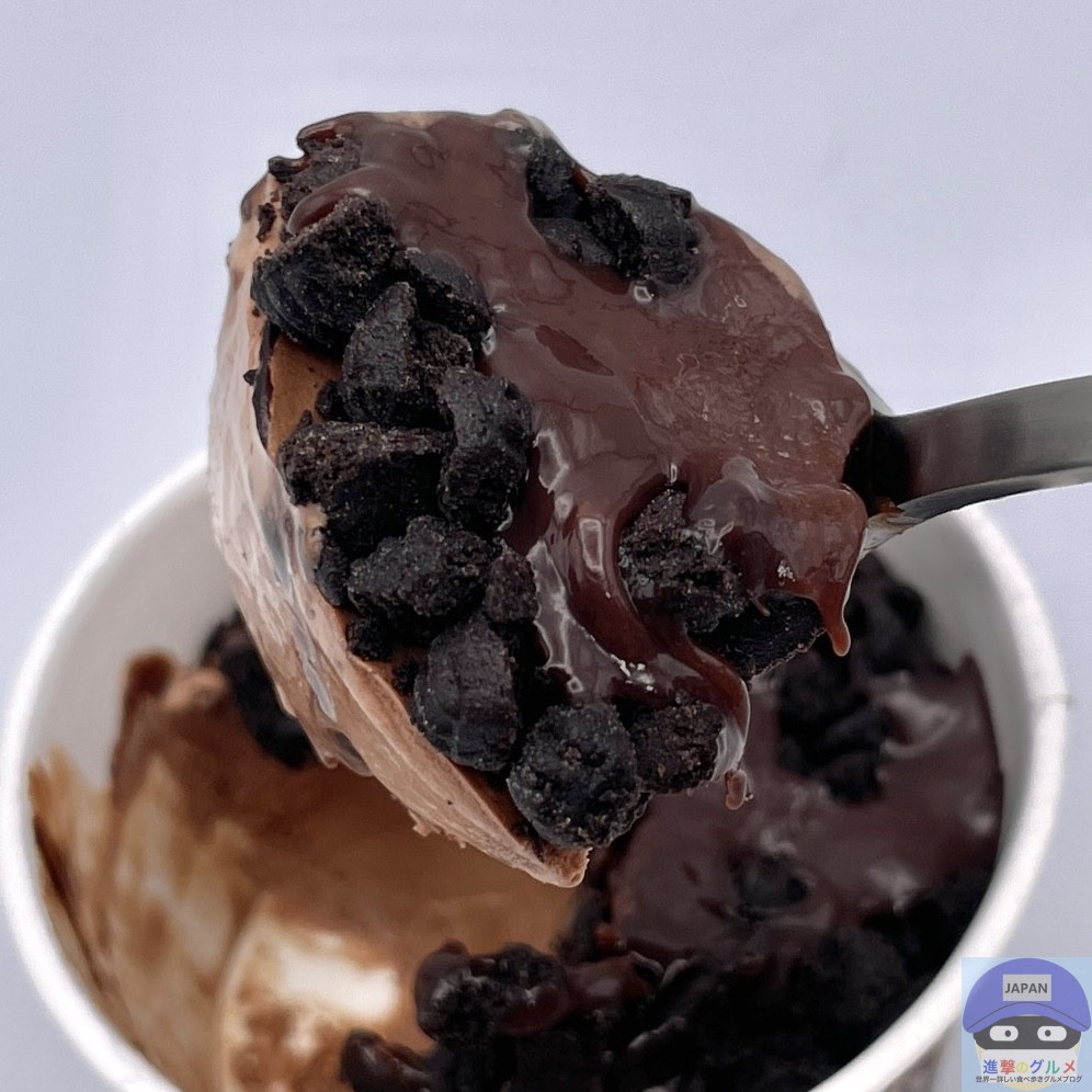 ソルティーチョコレートソースを混ぜ込んだチョコレートアイスクリームの上に、とろーりとしたバターココアソースにまみれた、ねっちり食感のチョコレートクッキーをのせました。