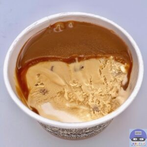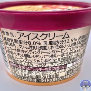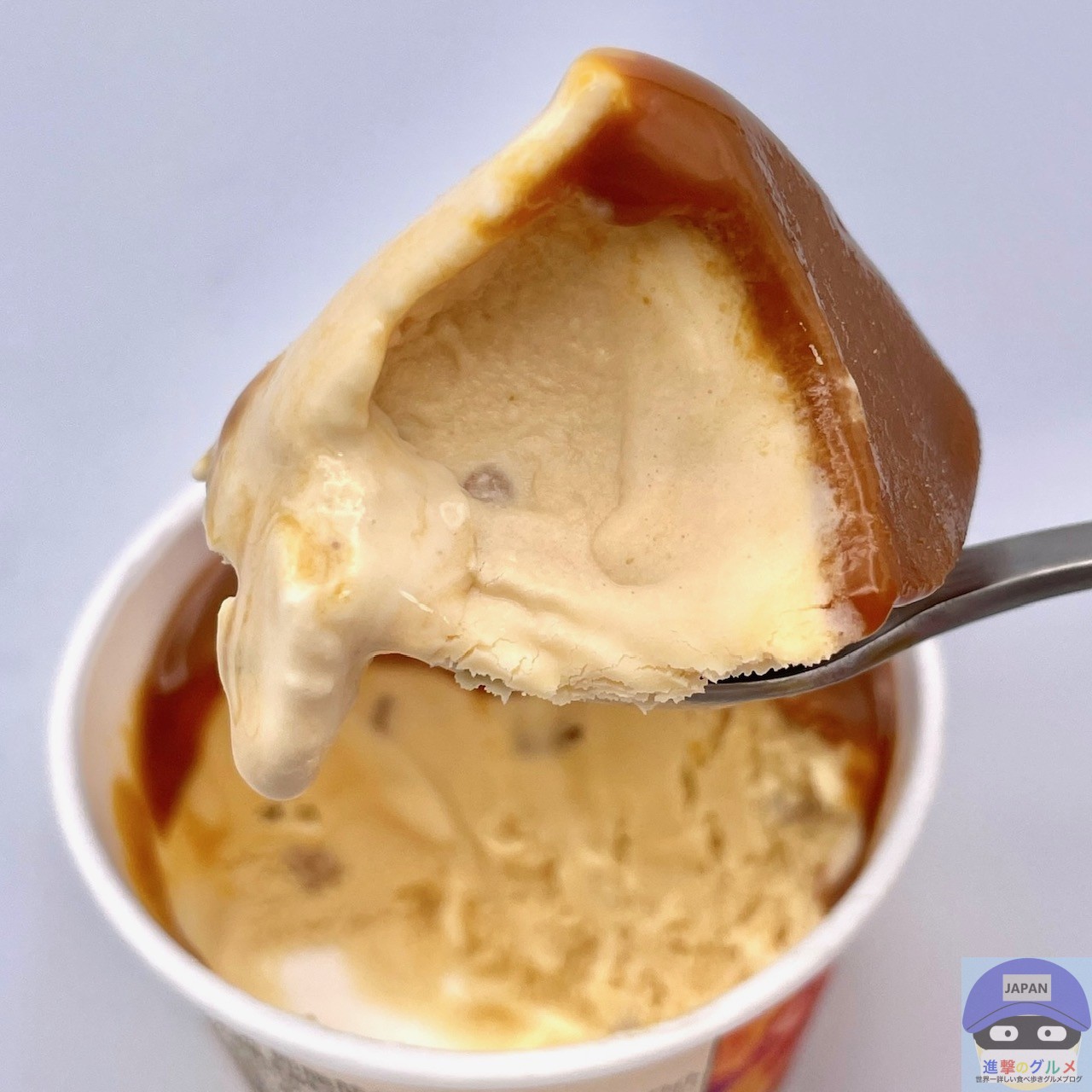 ホワイトチョコレートがけキャンディングアーモンドが多めに入ったカリカリ食感と香ばしさが印象的、程よい塩気で甘みが引き立ったキャラメルアイスクリームのまろやかなコクと濃厚な味わいがクセになります。
