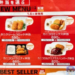 メニューは、「カニクリームコロッケ弁当(590円)」、「カニコロバラエティ弁当(660円)」、「カニコロミックス弁当(690円)」、「カニコロ&デミグラスハンバーグ弁当(820円)」、「カニクリームコロッケ・単品(180円)」があります。