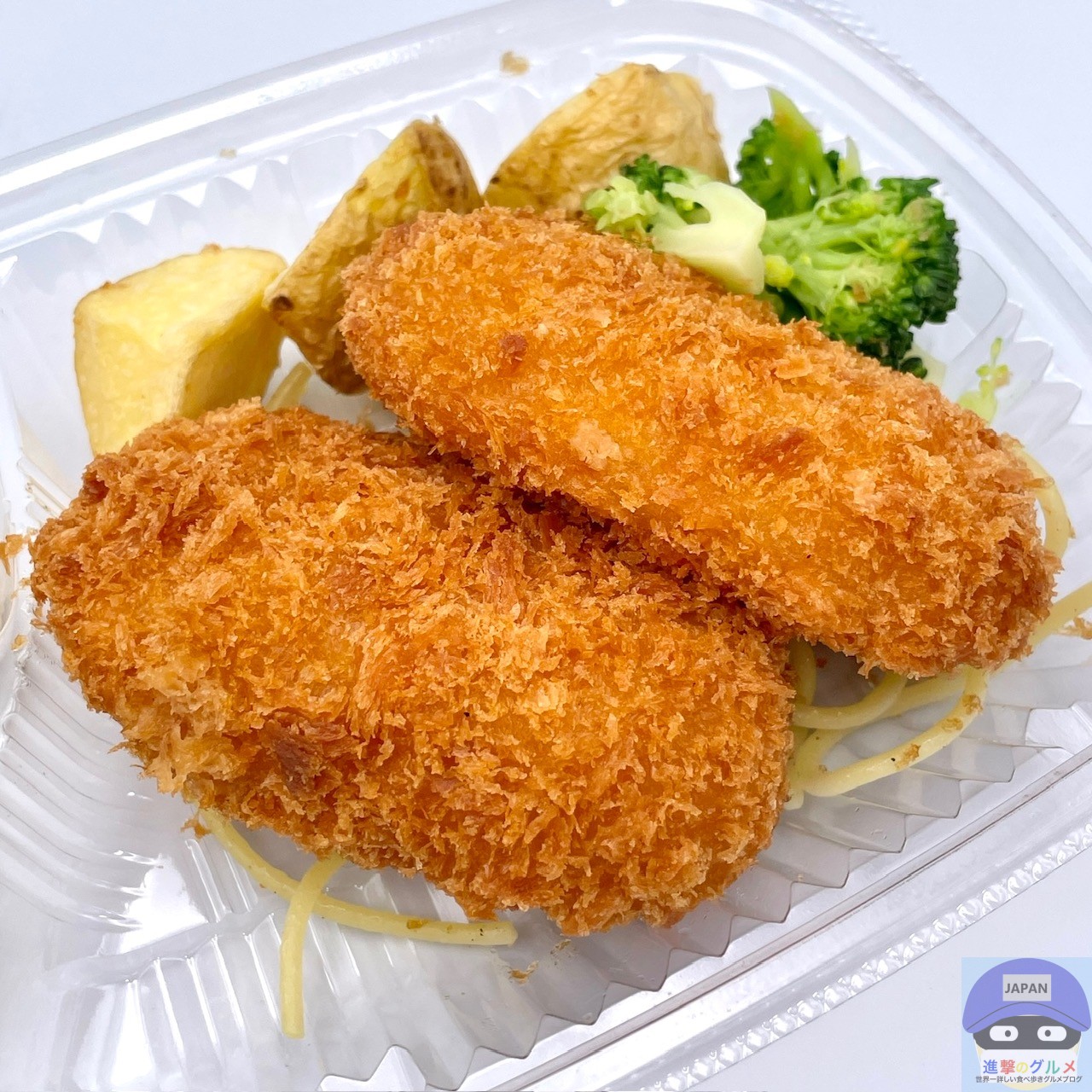 カニクリームコロッケ2個、スパゲッティ、皮付きフライドポテト、ブロッコリー、ポテトサラダ、漬物、ライスの組み合わせです。