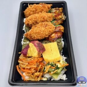 コクうま牡蠣5個(醤油ダレの蒸し牡蠣)、カキフライ3個、さつまいも、だし巻き玉子、きんぴらごぼう、おひたし、海苔、ライスの組み合わせです。