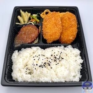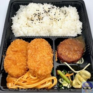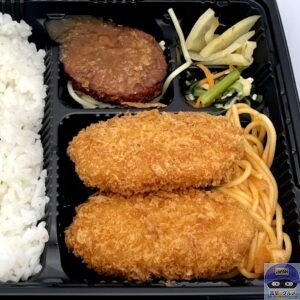 カニクリームコロッケ2個、ナポリタン、ミニハンバーグ、おひたし、漬物、ライスの組み合わせです。