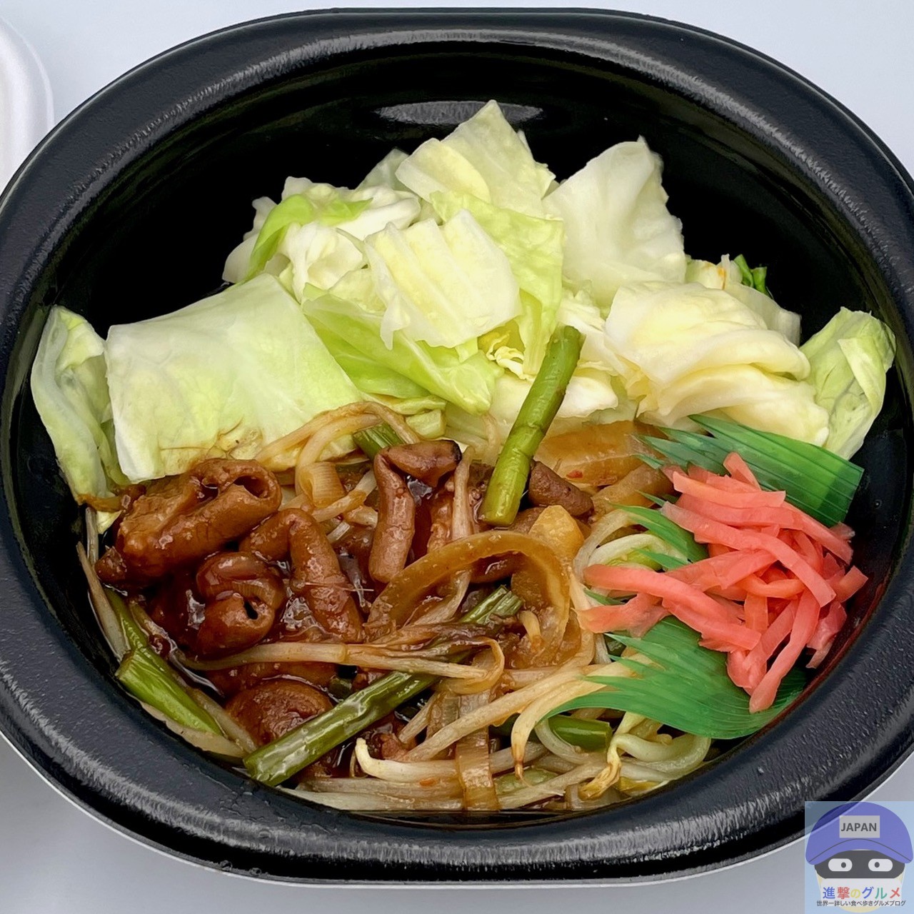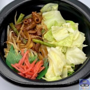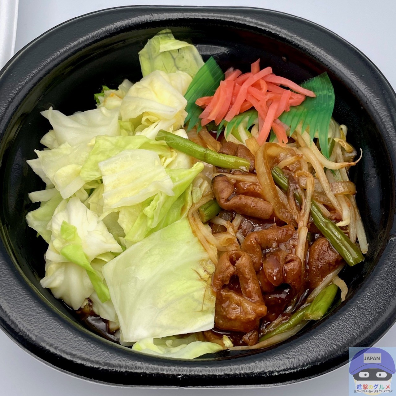 牛もつ(7切れ)・玉ねぎ・もやし・にんにくの芽を甘辛たれで焼き上げ、たっぷりのキャベツと一緒に盛りつけて紅生姜を添えています。