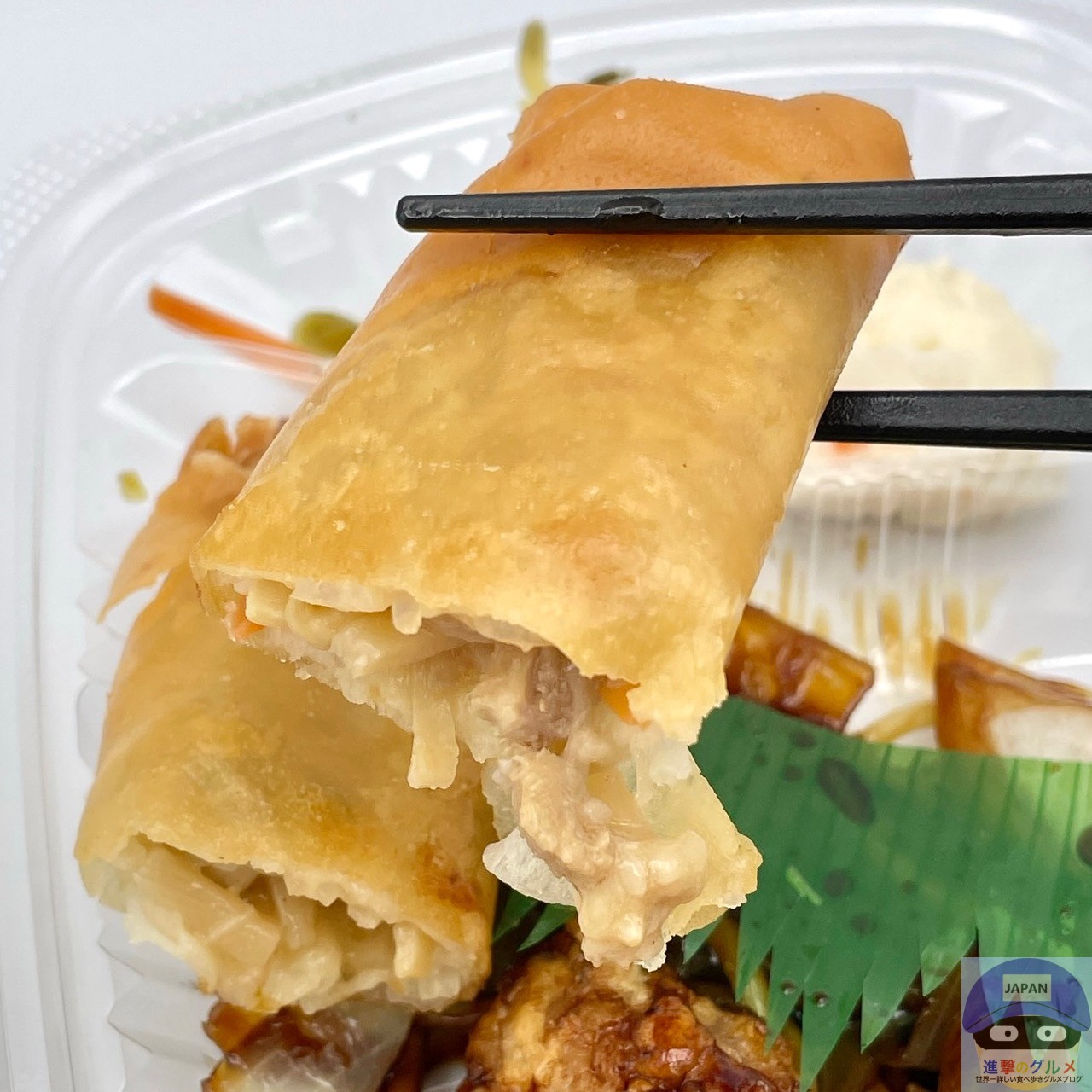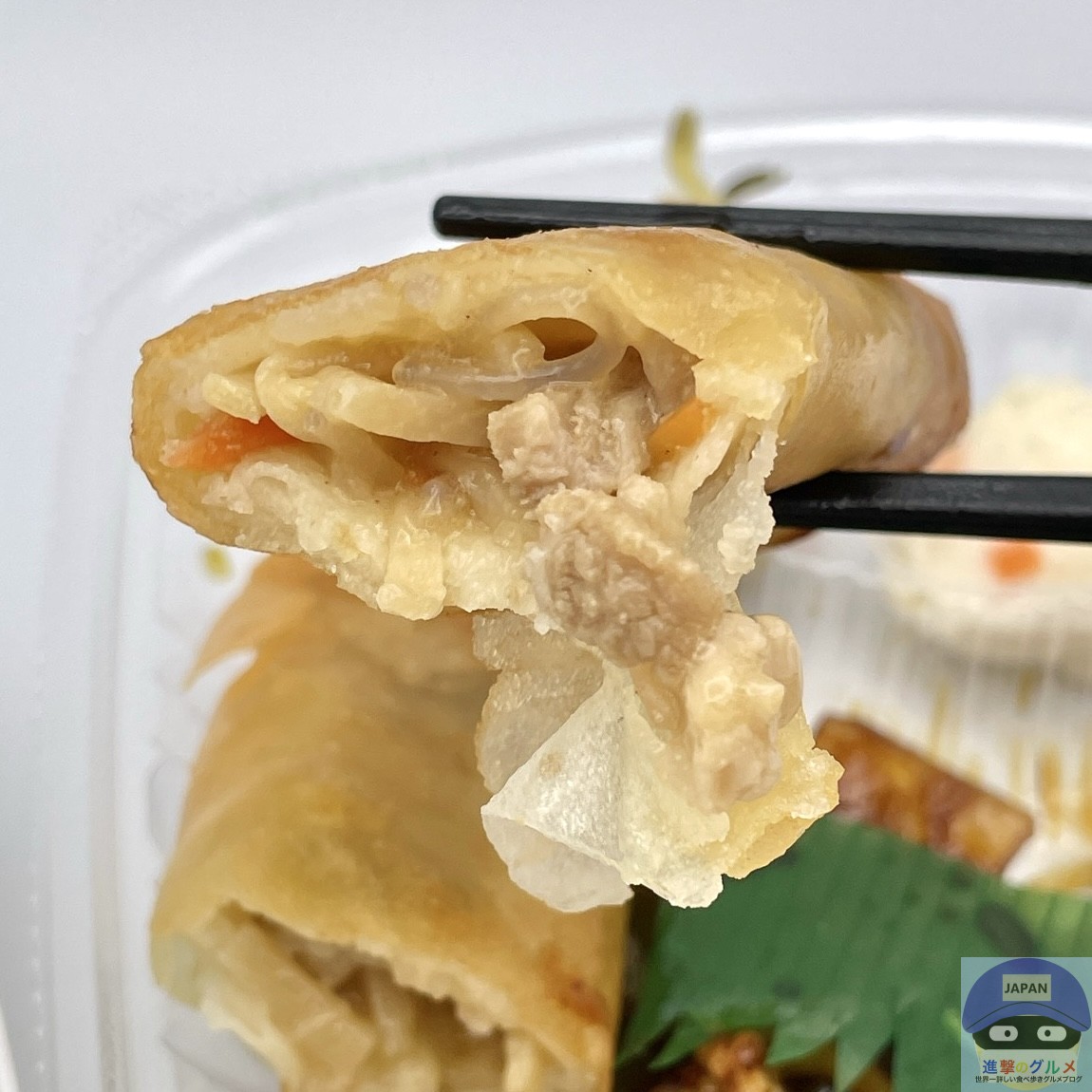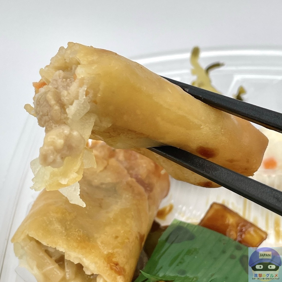 油を吸った皮がパリッと香ばしく、筍や春雨などの食感、豚肉や椎茸の旨み、春巻特有の味付けがクセになります。