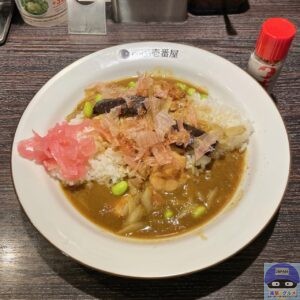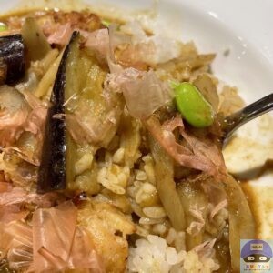 ライス250gに和風カレーソースをかけて、枝豆、なす、かつお節、大根漬けをトッピングした魅力的な見た目です。