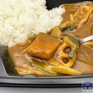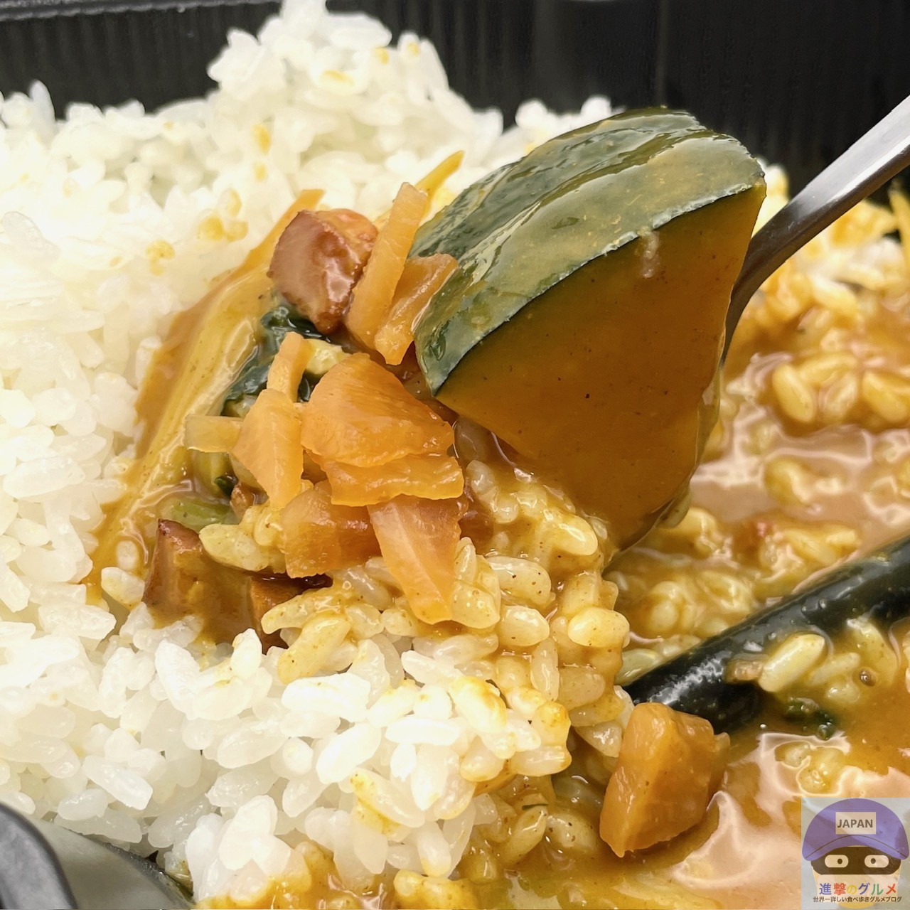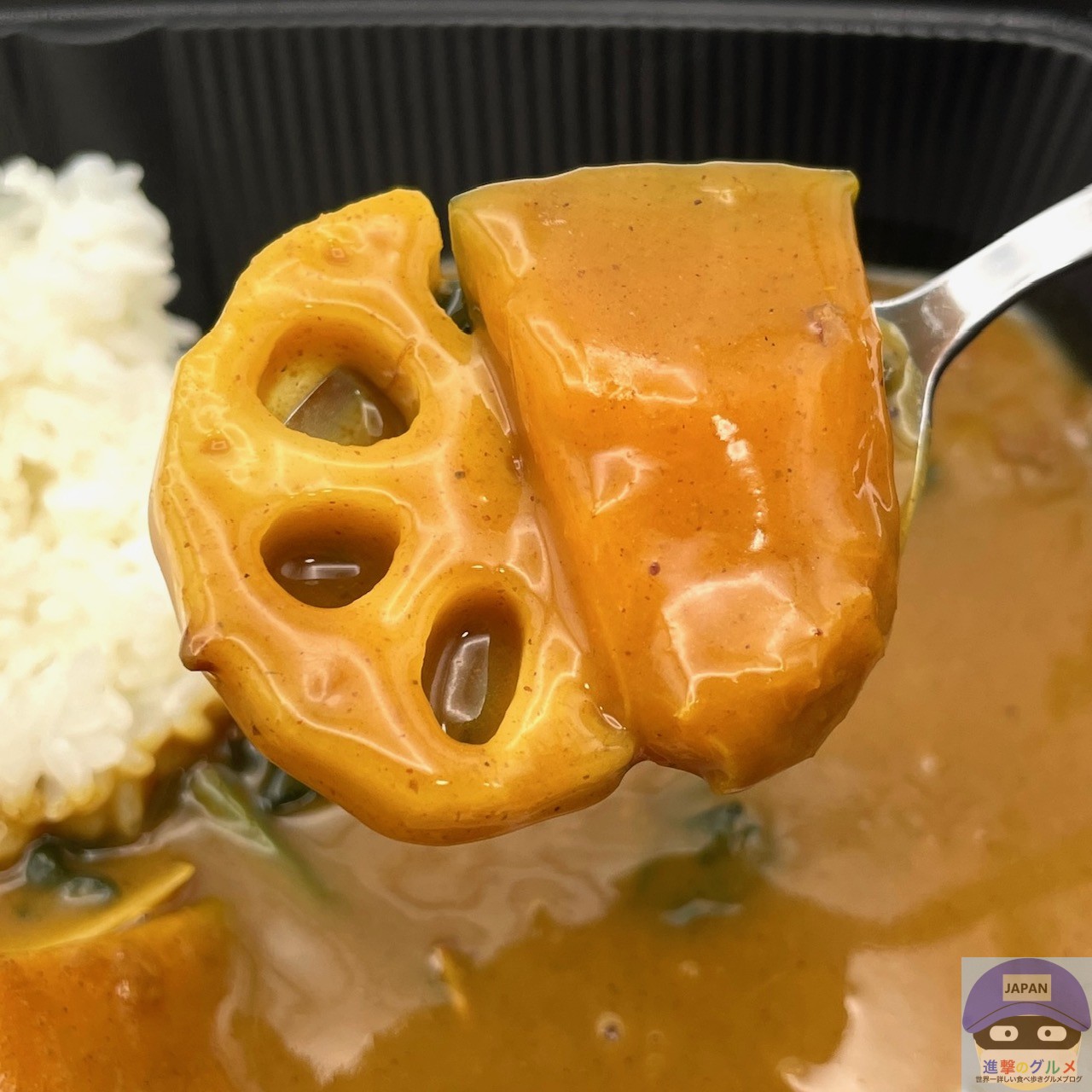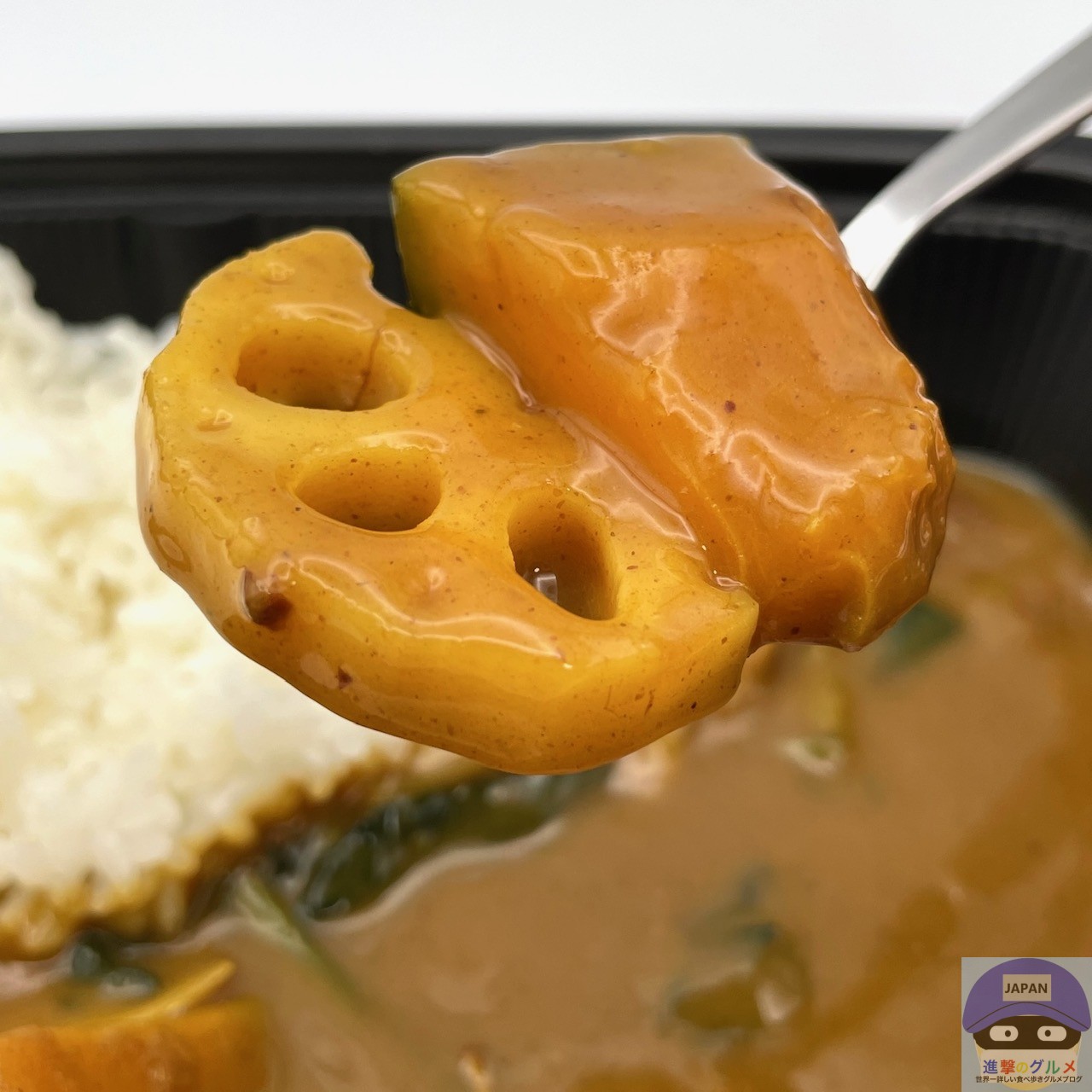 とろみがあってスパイシー、すっきりした旨みで辛さは中辛くらい、シャリッとしたれんこんの味わい、やわらかいかぼちゃの少し甘みを感じます。