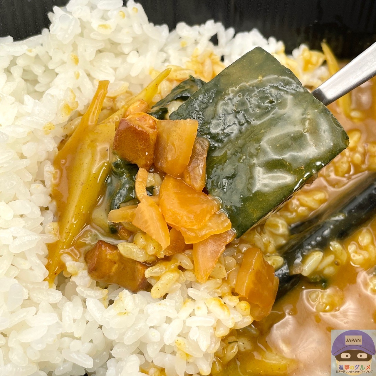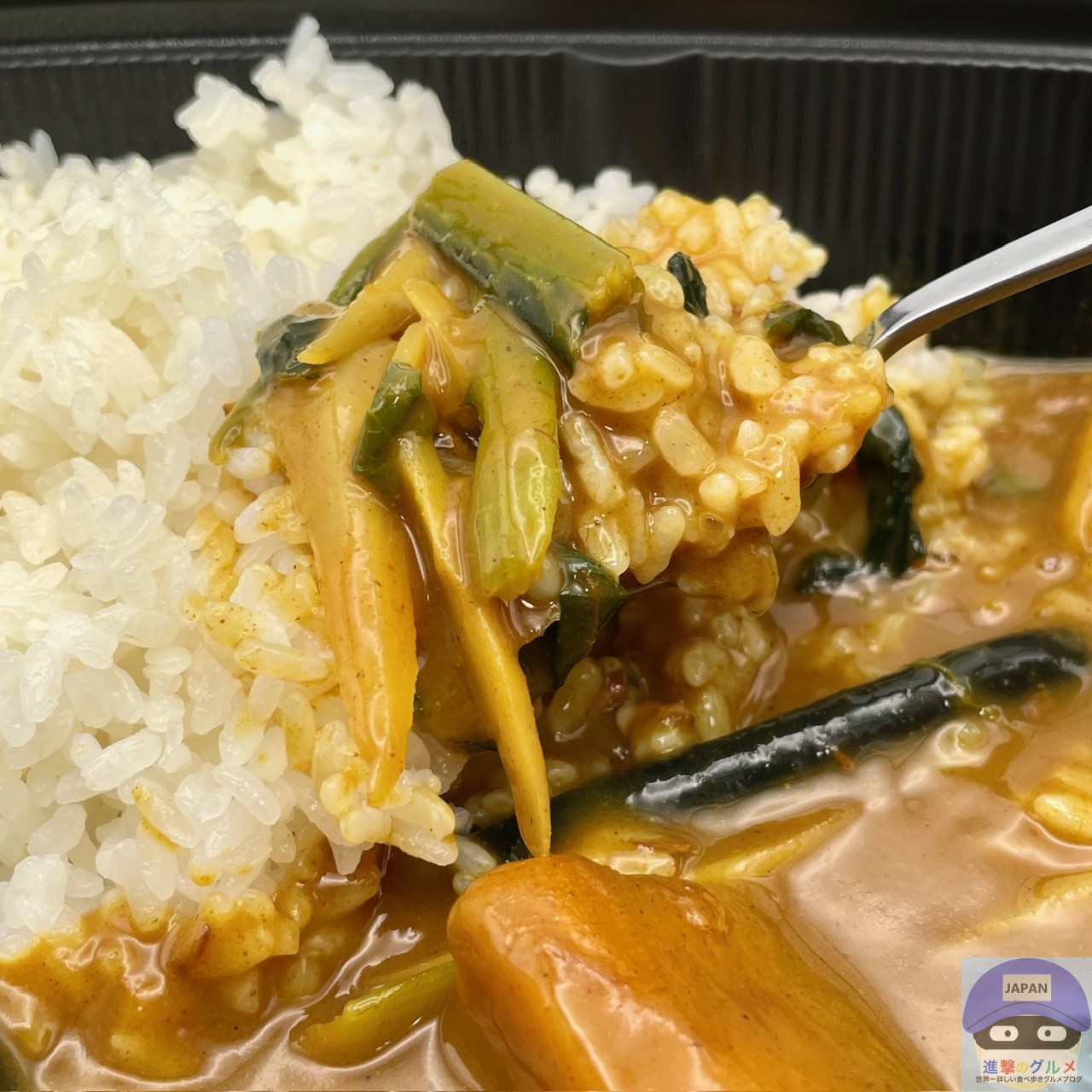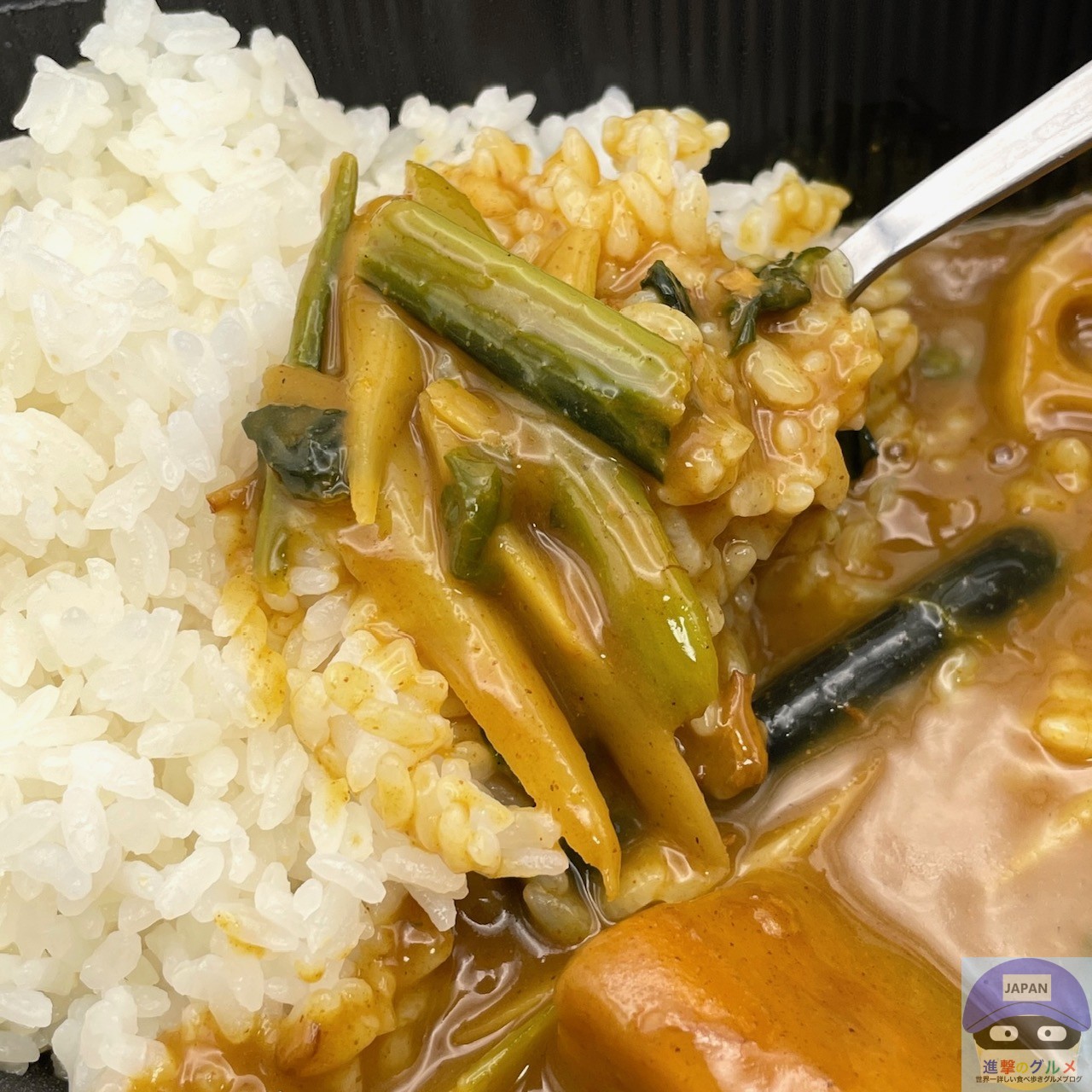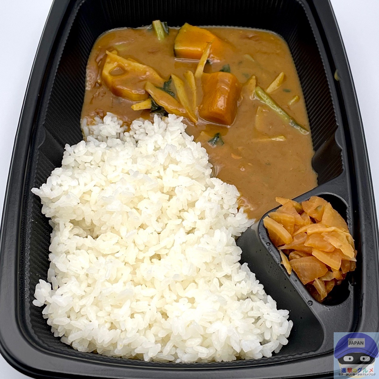とろみがあってスパイシー、すっきりした旨みで辛さは中辛くらい、シャリッとしたれんこんの味わい、やわらかいかぼちゃの少し甘みを感じます。