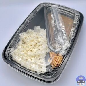 ライス300g、カレーソース、福神漬けの組み合わせ、シンプルな見た目のカレーライスです。