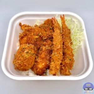 3種類の揚げ物を醤油ベースのあまじょっぱいタレに豪快にまるごとくぐらせ白米の上に盛りつけています。