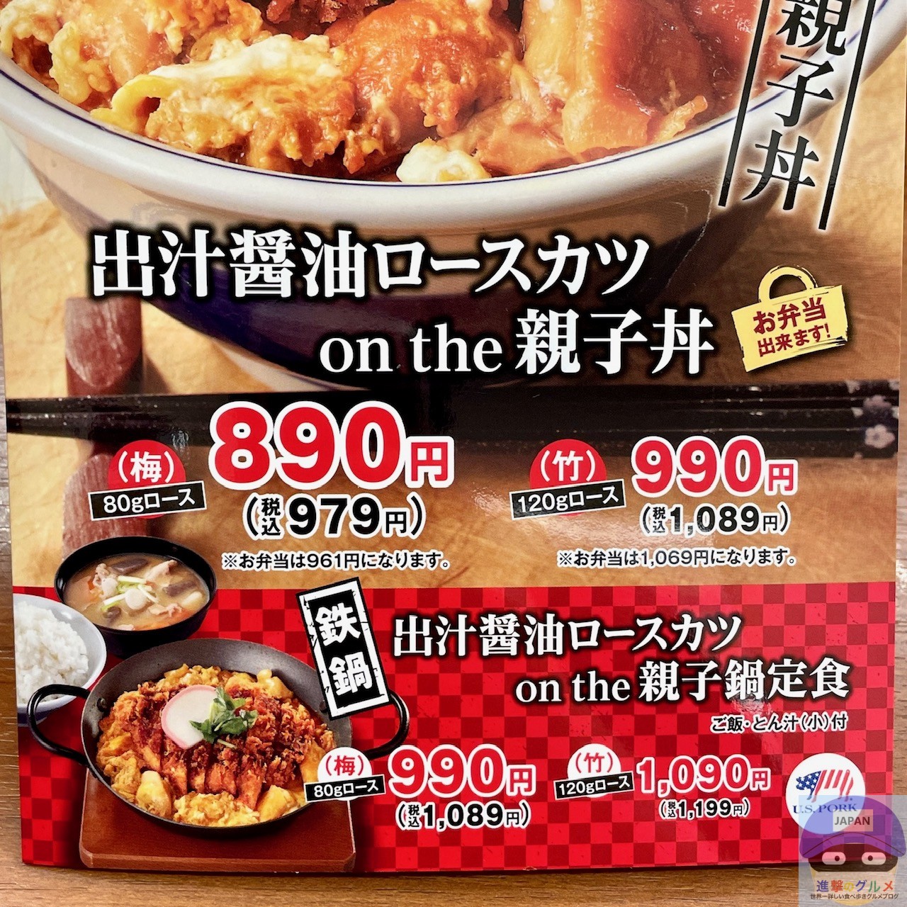 メニューは、「出汁醤油ロースカツ on the 親子丼(梅 : 979円、竹 : 1089円)」、「出汁醤油ロースカツ on the 親子鍋定食(梅 : 1089円、竹 : 1199円)」があります。