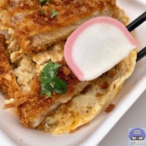 鶏肉・玉ねぎ・玉子・割り下・ご飯で作られた親子丼に、甘口出汁醤油をかけた120gロースのカツをのせ、かまぼこと三つ葉を添えています。