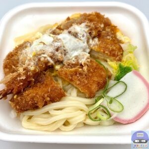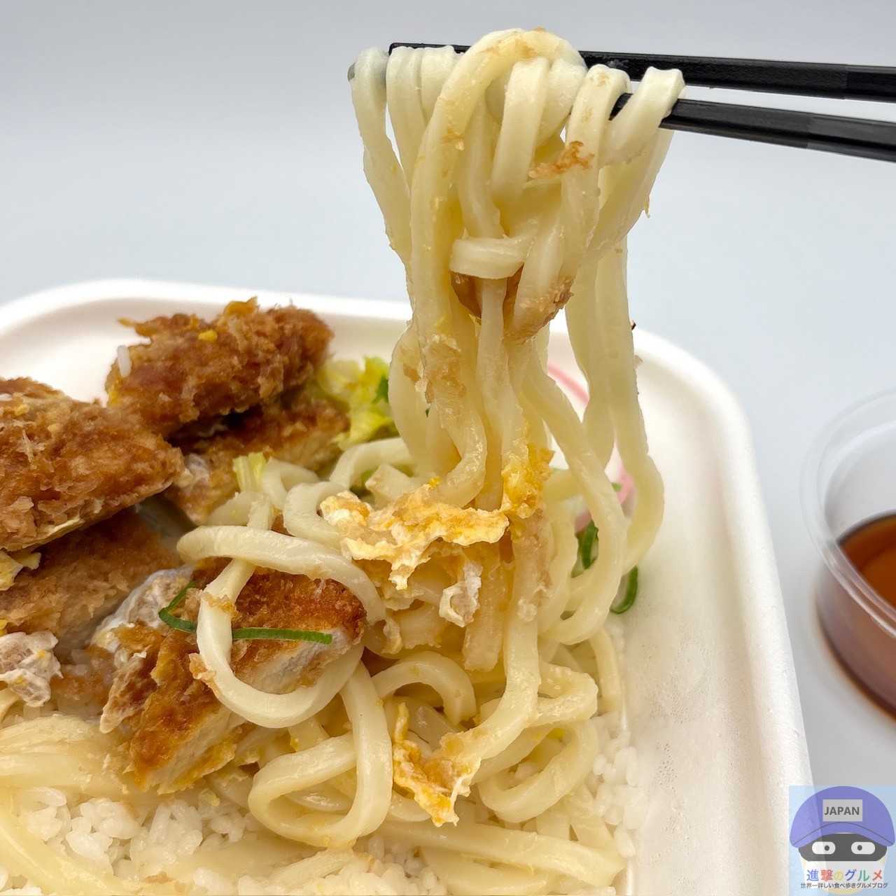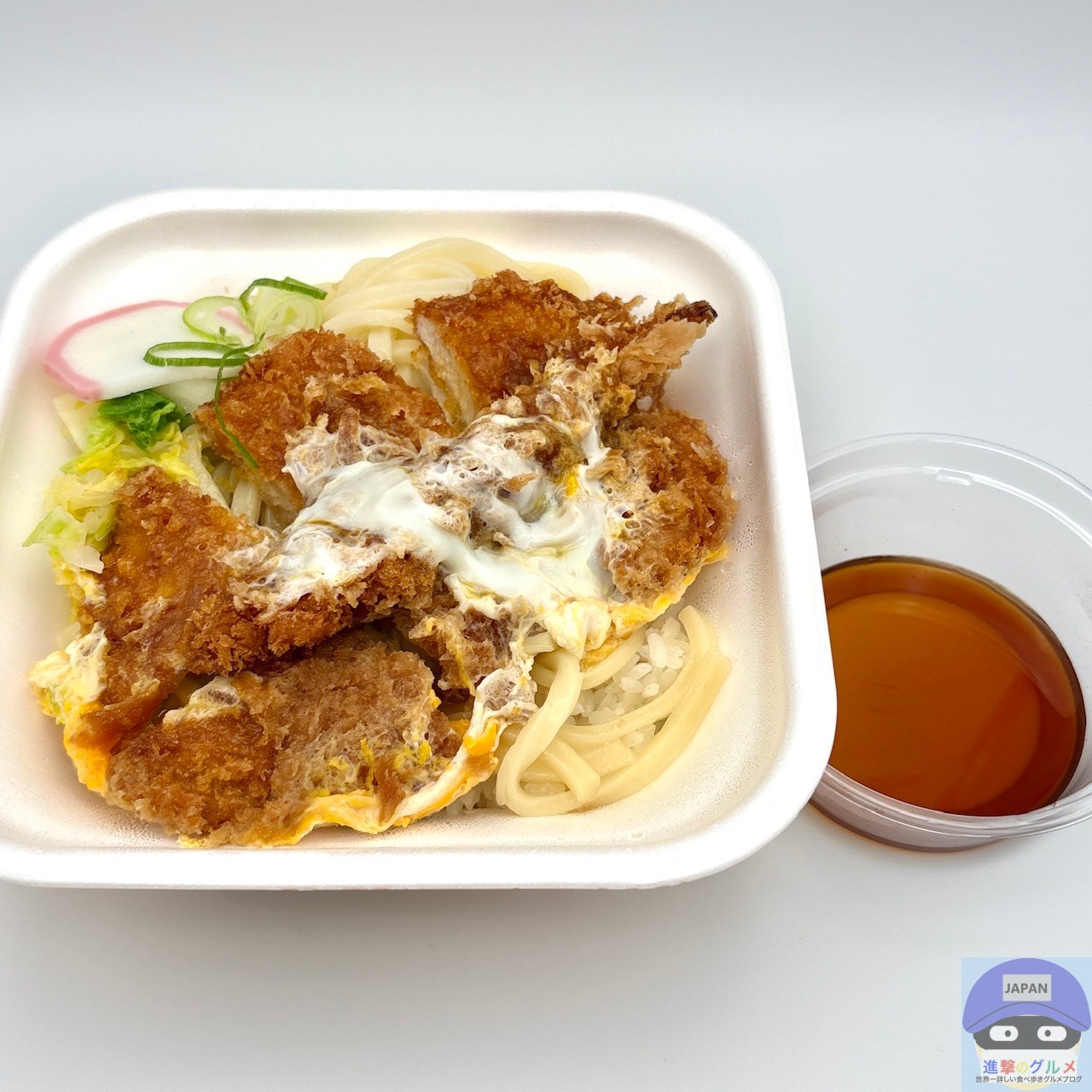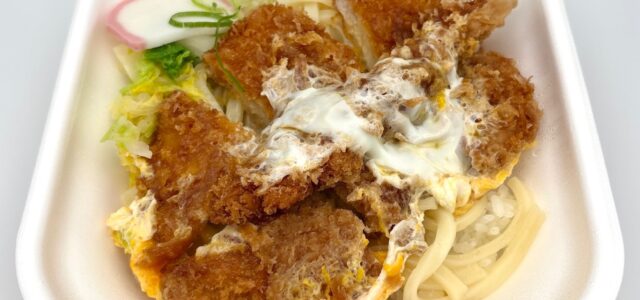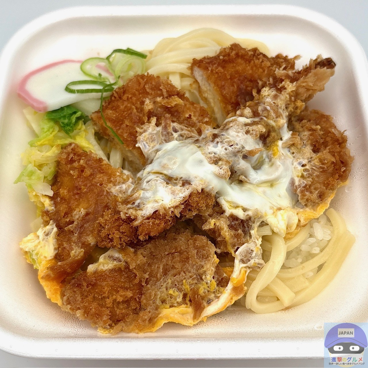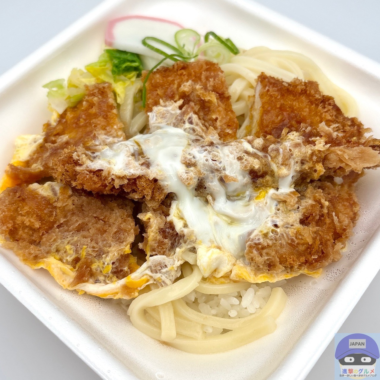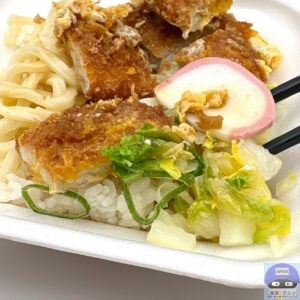 ご飯にうどんを盛りつけ、玉子でとじたロースカツと海老フライをのせ、白菜・かまぼこ・ねぎを合わせた「うどん入りカツ丼」です。