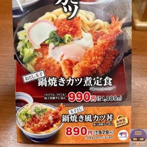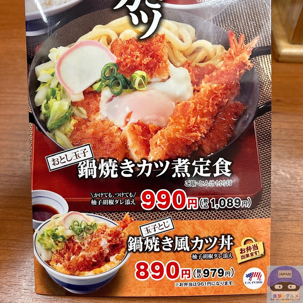 メニューは、「鍋焼きカツ煮定食(1089円)」、「鍋焼き風カツ丼(979円)」があります。