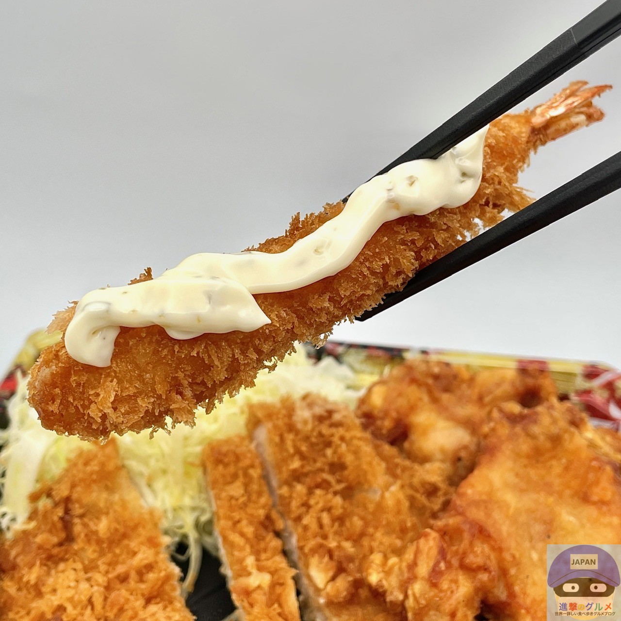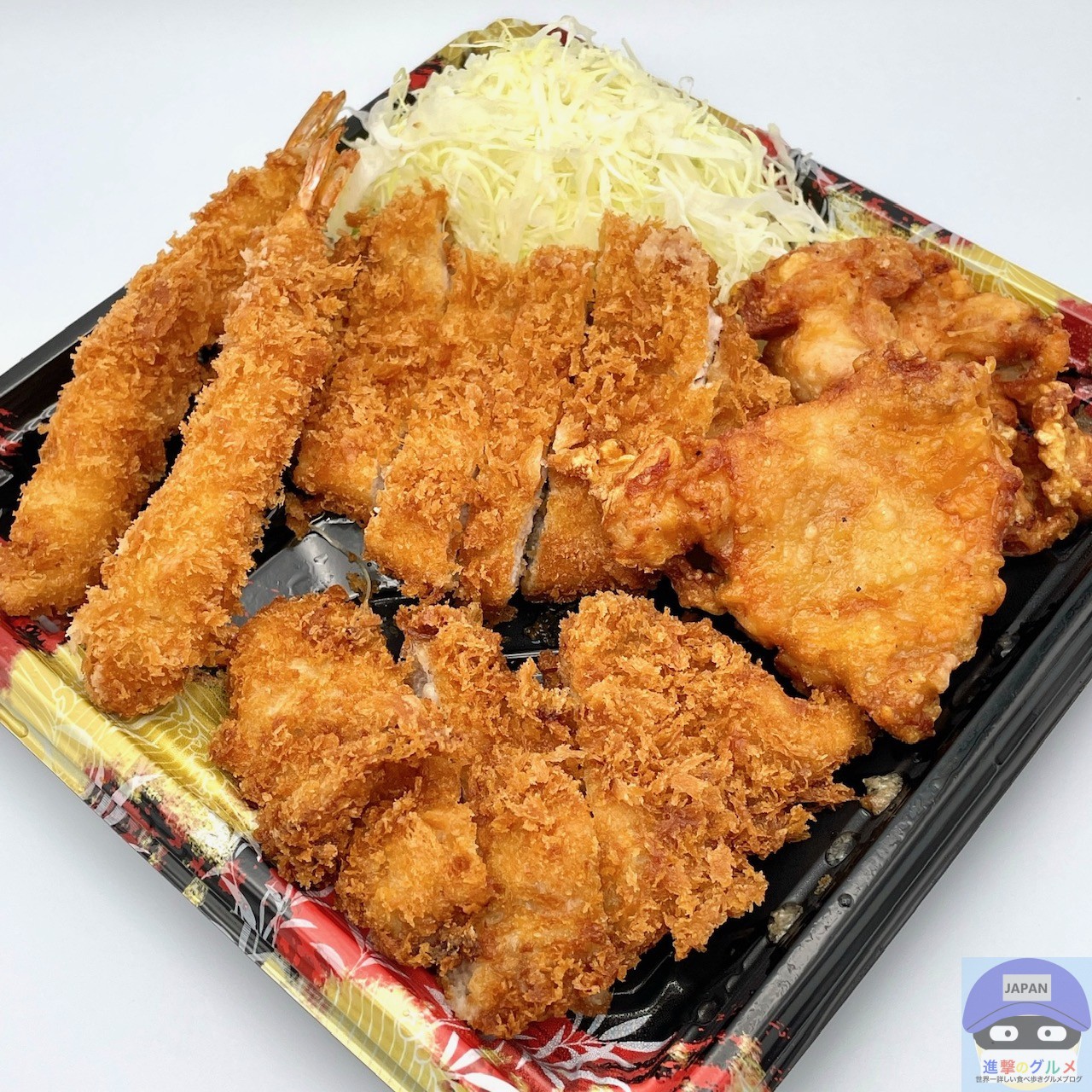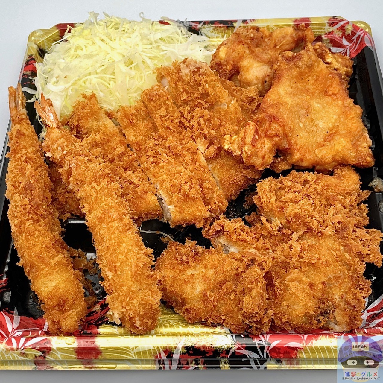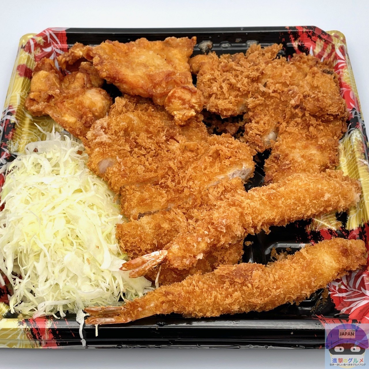 80gロース1枚、チキンカツ1枚、海老フライ2本、から揚げ2個、キャベツです。