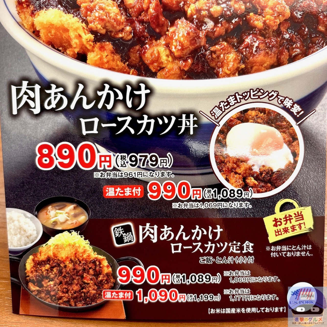 メニューは、「肉あんかけロースカツ丼(979円)」、「肉あんかけロースカツ丼・温たま付き(1089円)」、「肉あんかけロースカツ定食(1089円)」があります。