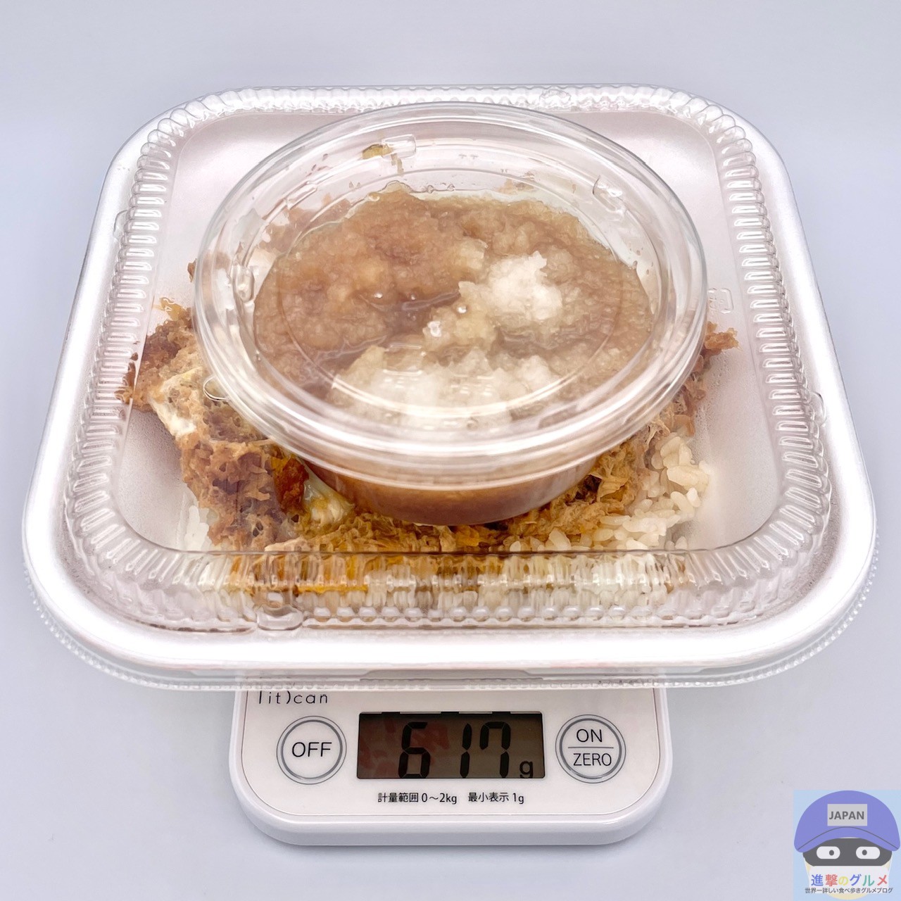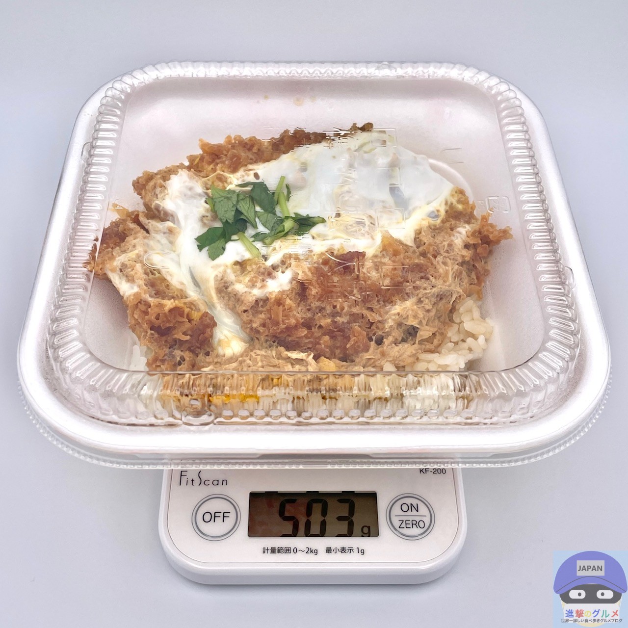 重さをはかると、容器を含めて617g(カツ丼503g)でした。