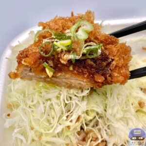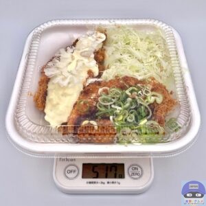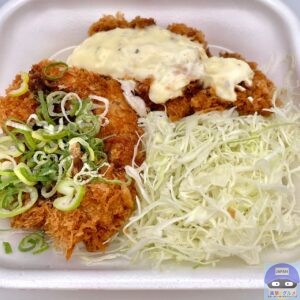 チキンカツ2枚、特製ウスターソース、タルタルソース、ねぎ、キャベツ、ご飯で作られています。