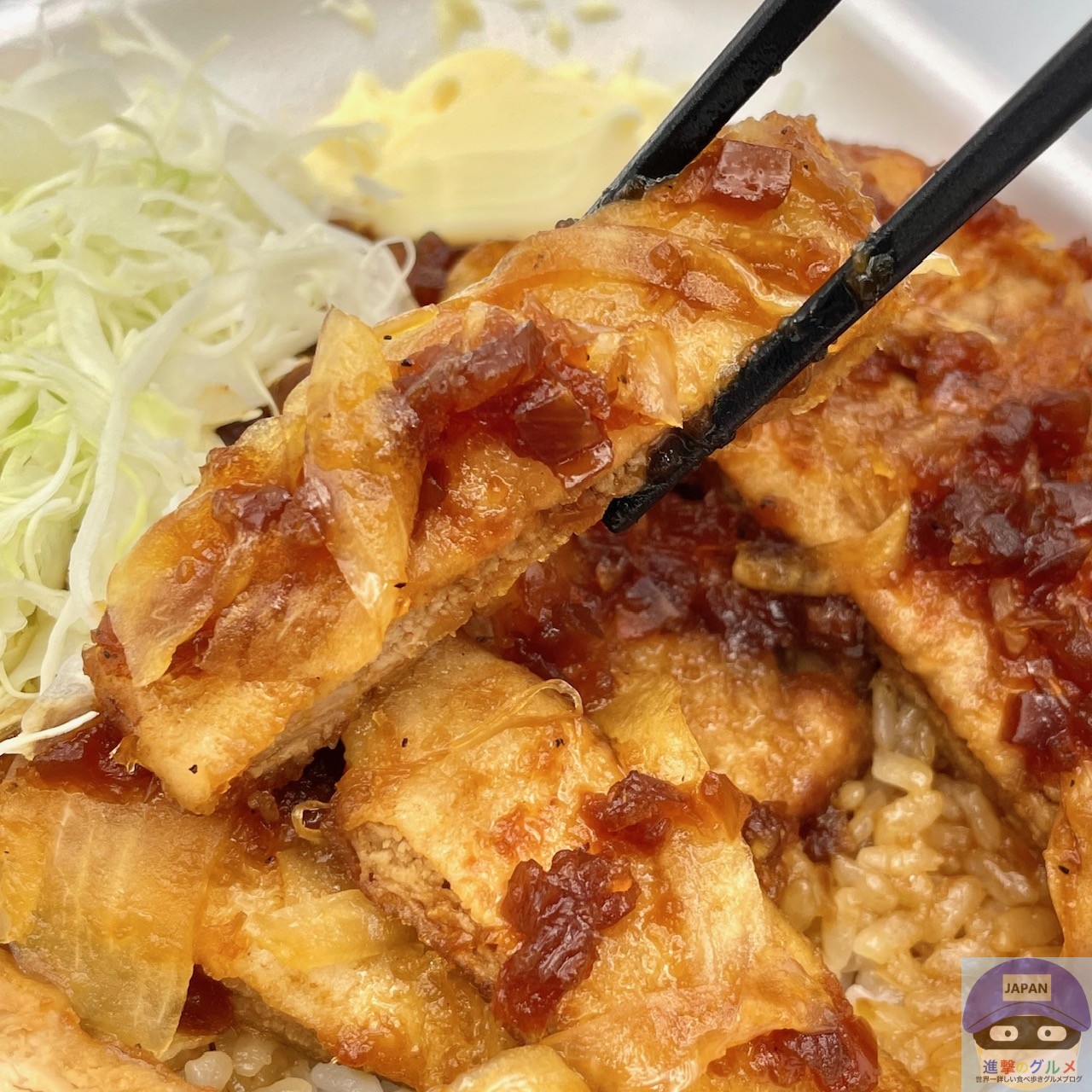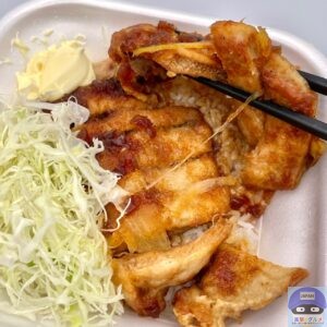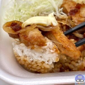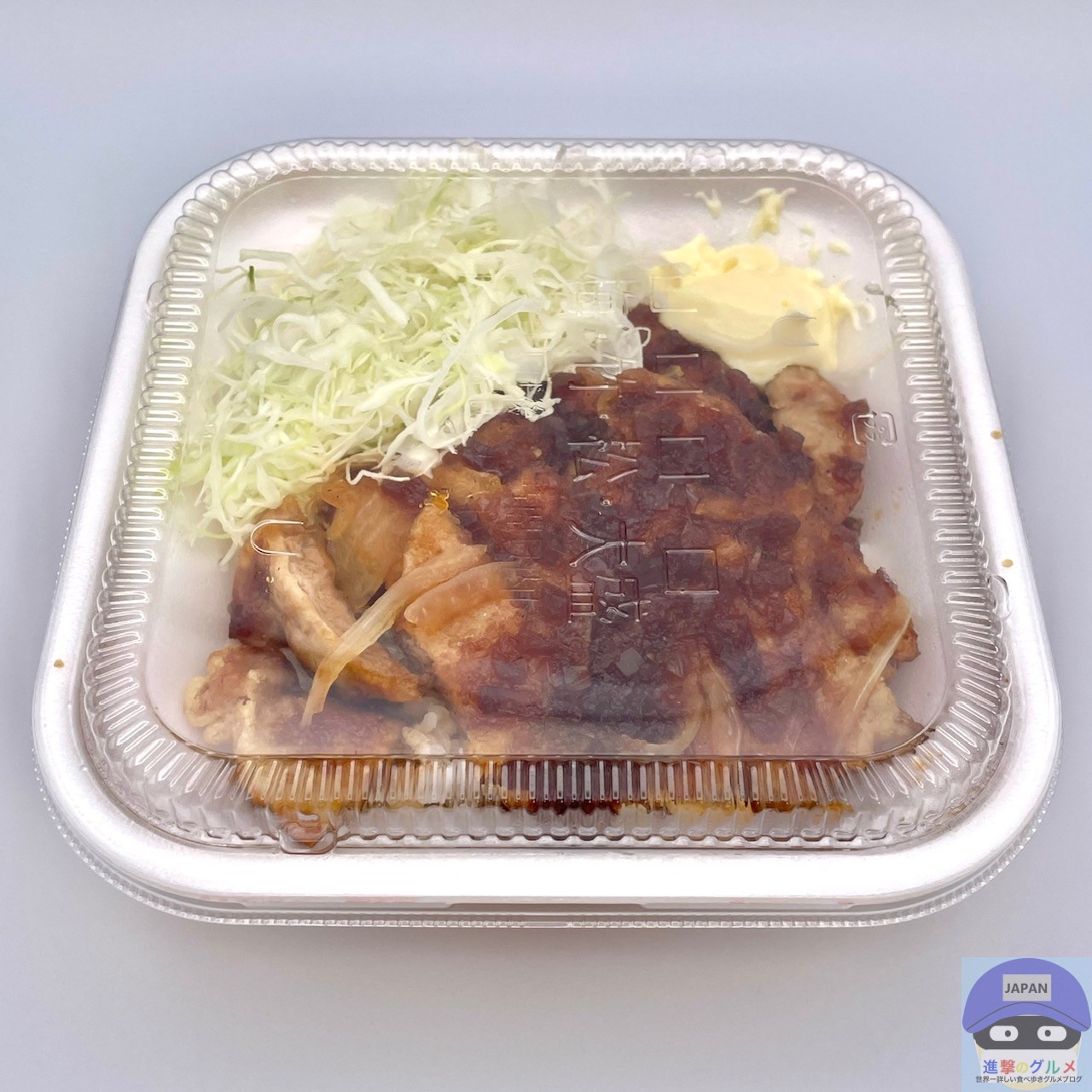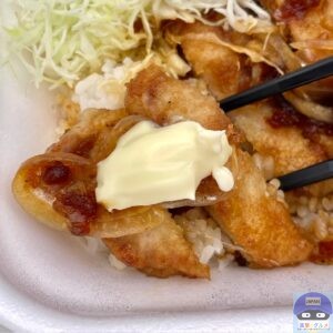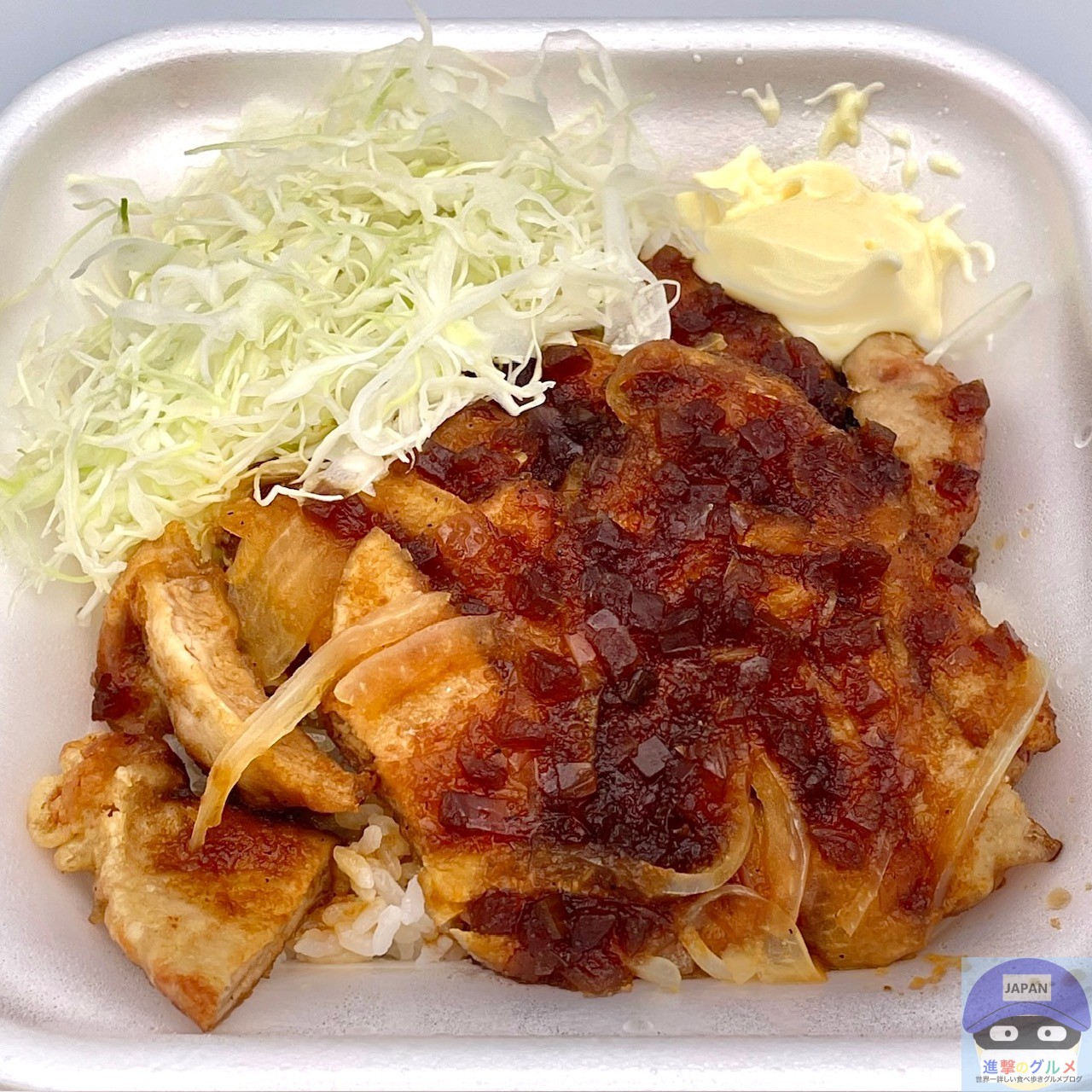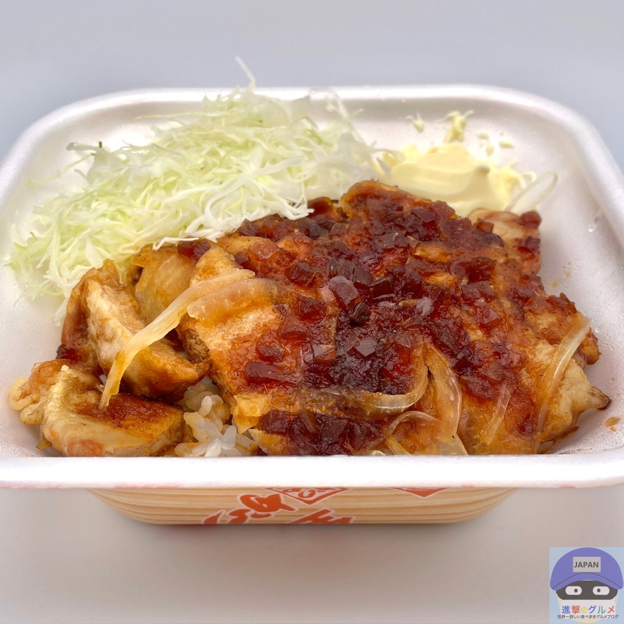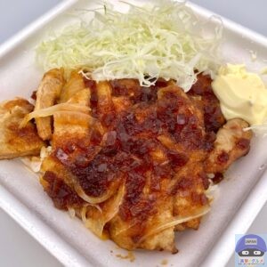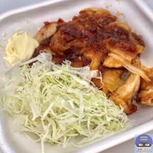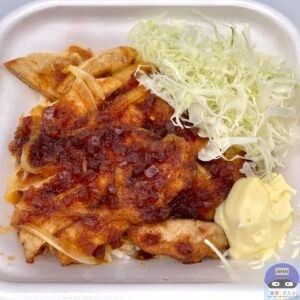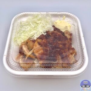 醤油ダレとバターで仕上げた80g豚ロース2枚と玉ねぎ、キャベツ、マヨネーズ、ご飯で作られています。