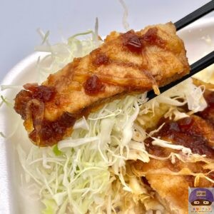 牡蠣醤油を使用した甘辛い特製タレをたっぷりかけています。