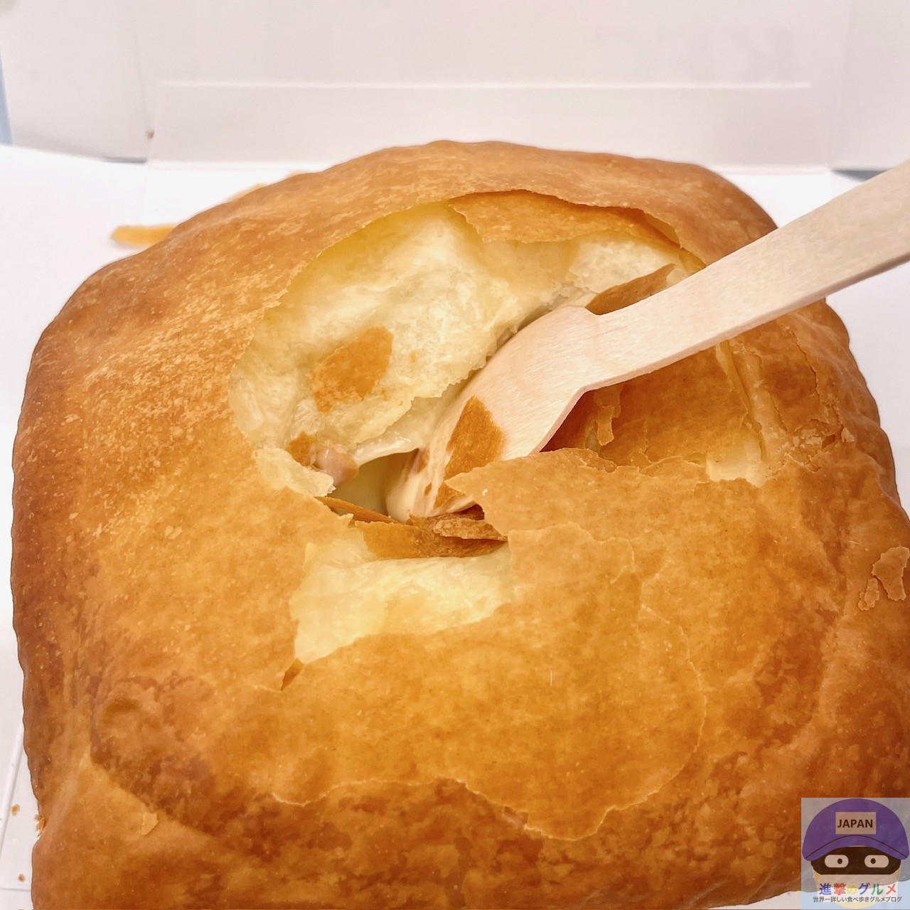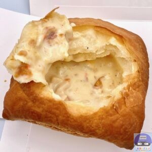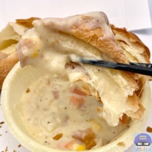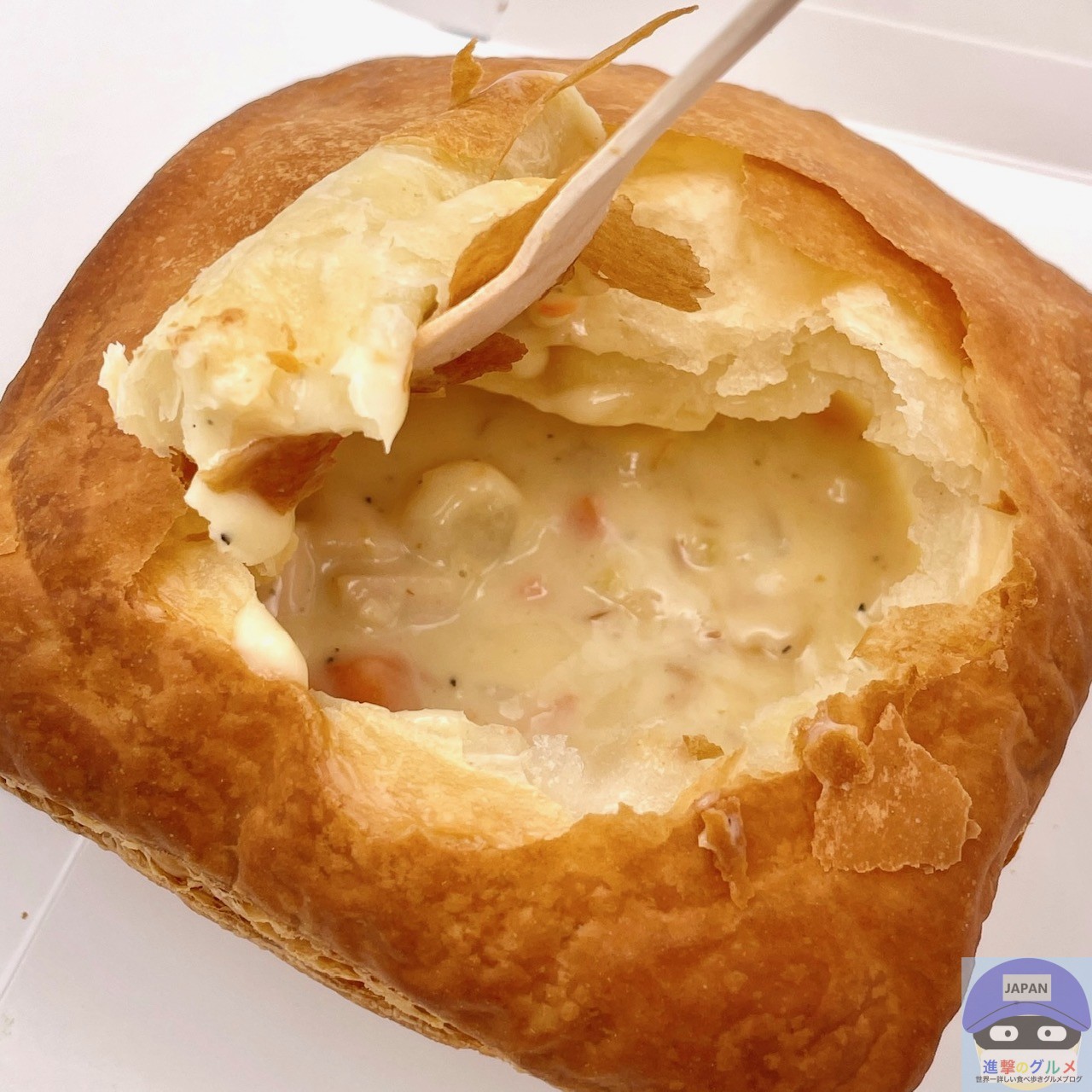 クリームシチューが入った容器の上に、厚みのあるパイ生地がのっています。