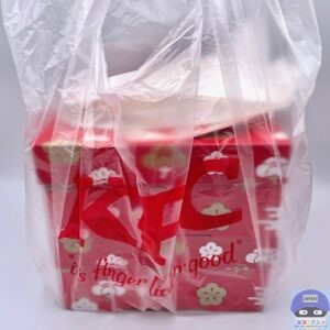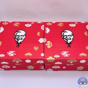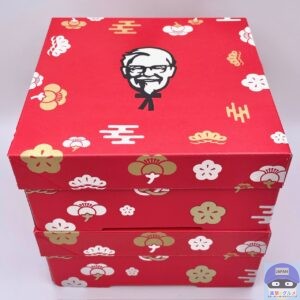 専用の紙製の重箱2段でソース、クーポンつきケンタおみくじが付いています。