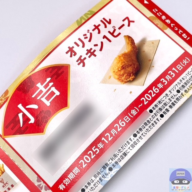 クーポンつきケンタおみくじは、小吉「オリジナルチキン」1ピース無料券が当選しました。